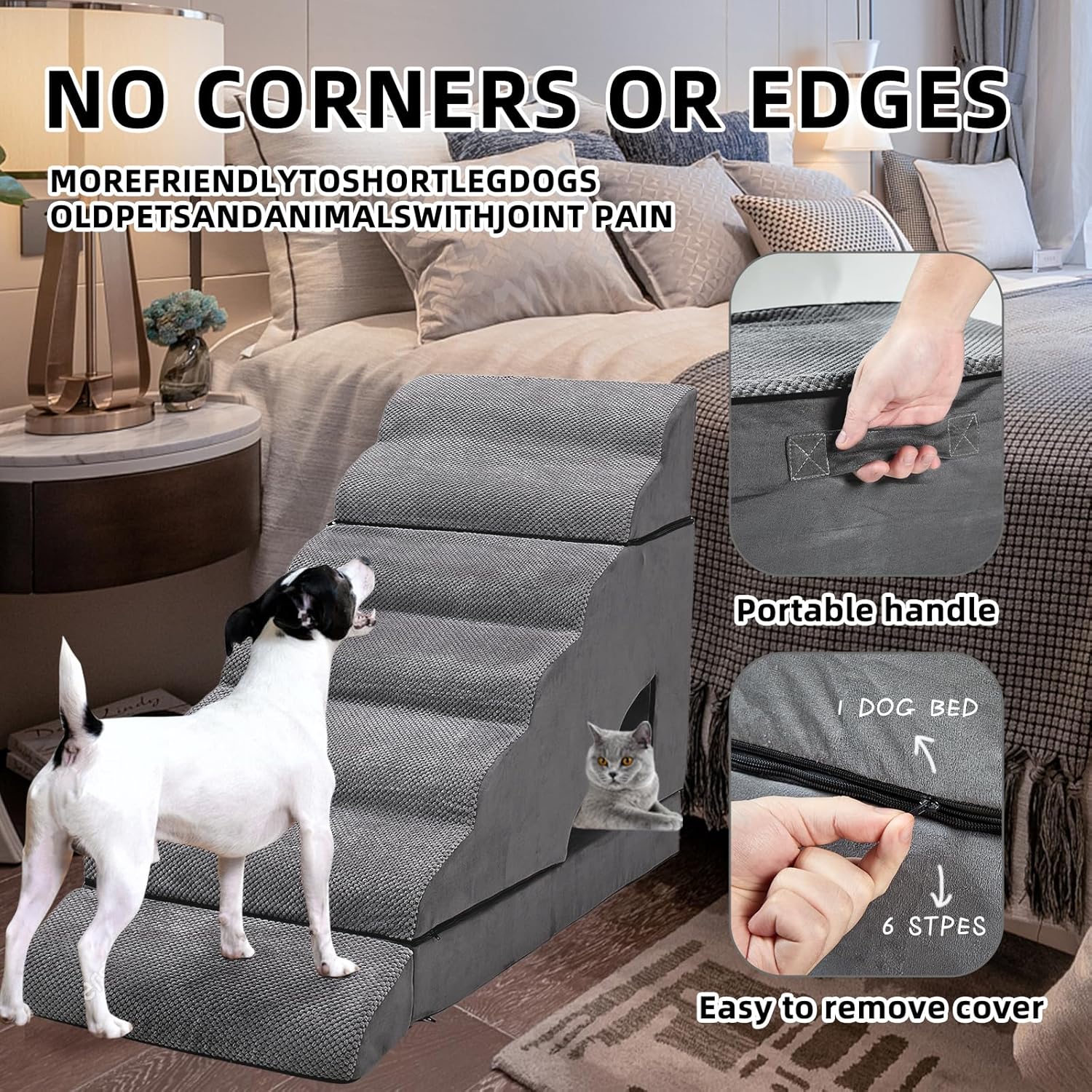 - [Our stairs can used for stairs and dog bed]: The bottom of our stairs has a big dog bed ,dog and cat can sleep on it ,if you do not need to use the bed,you can link 6-tier dog stairs ,it will become 7-tier dog stairs ,if you buy our stairs you will get 7-tier dog steps ,6-tier dog steps ,one big dog bed ,Trust us ,It is right choosing us !