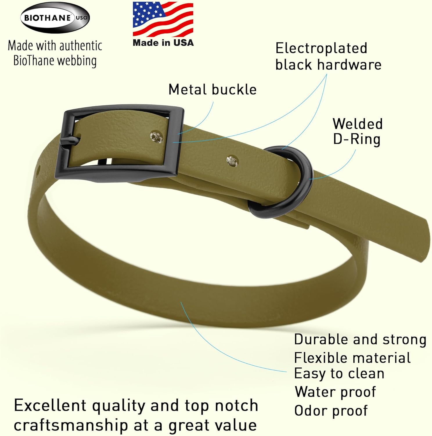 Dogline Biothane Waterproof Dog Collar Strong Coated Nylon Webbing with Black Hardware Odor- Proof for Easy Care Easy to Clean High Performance Fits Small Medium or Large Dogs, Olive Drab Green