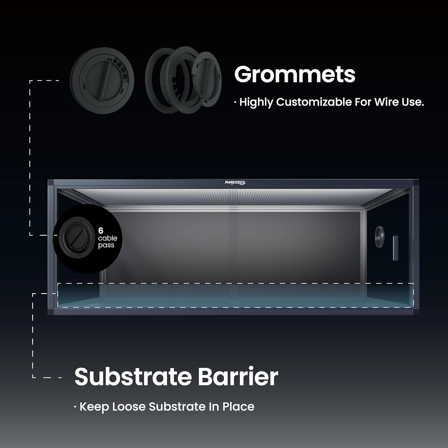 - ăEasy MaintenanceăFront opening reptile terrarium with door handles included for easy cleaning & feeding. No more suction cup problems or unsightly fingerprints all over. The substrate barrier keeps the substrate in place. Our tempered glass doors are durable enough to withstand scratching.
