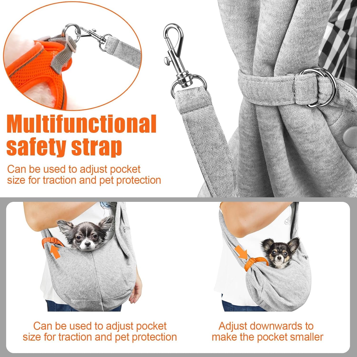 - Sufficient Safety: pets can be easily put into TOMKAS small dog carrier sling after a brief acclimation. You just put your dog in it, attach the safety buckle to the leash buckle on the vest or harness. If your pet wants to jump out of the pouch, the safety belt will stop it from this dangerous behavior and keep your puppy safe. TOMKAS small dog sling is very reliable in terms of safety.Remember, never tie the safety buckle to the collar, it could hurt the dog's neck if it jumps out.