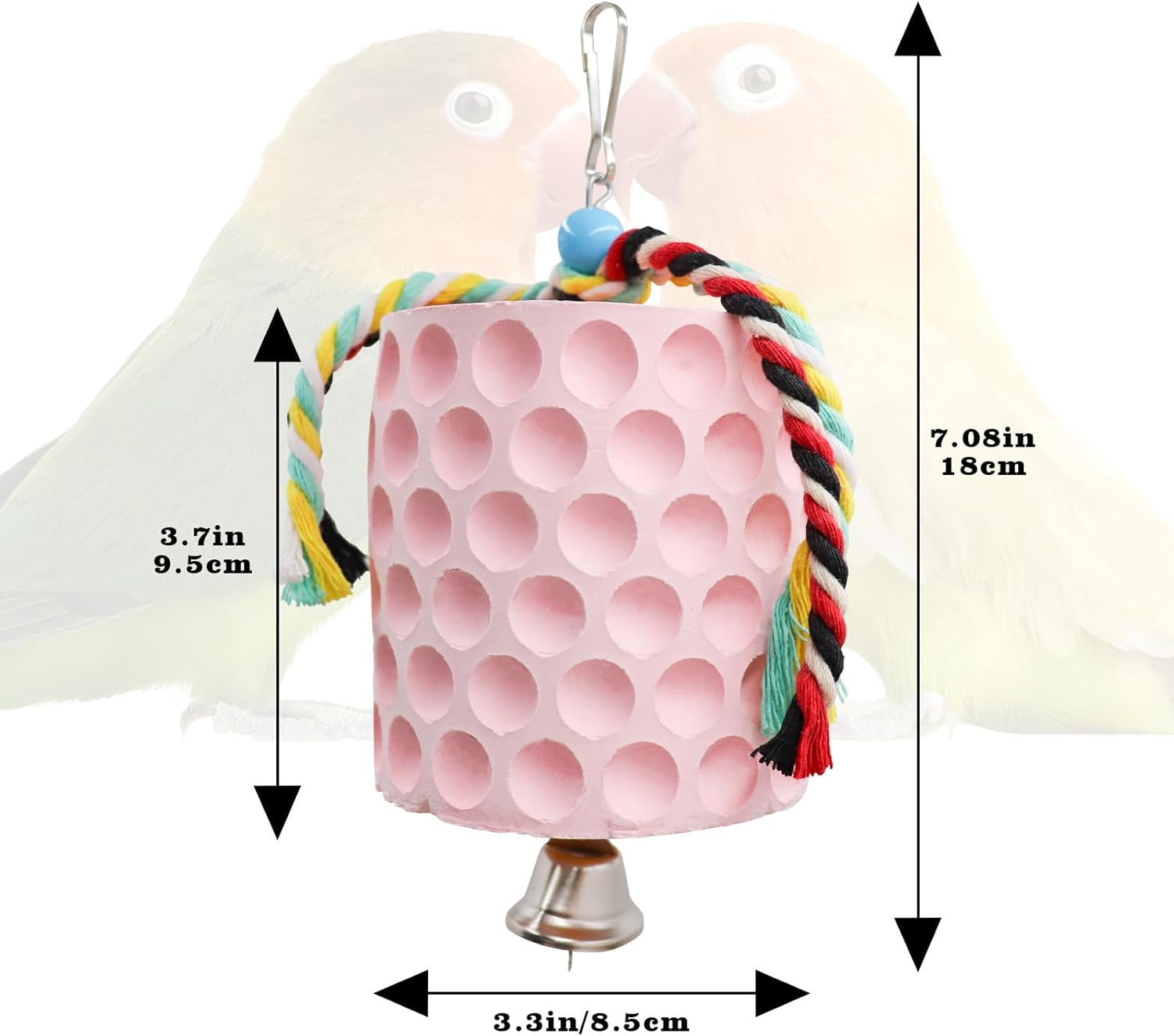 • Easy to Install: The diameter of the bird calcium block toy is 3.3 inches and the height of calcium stone is 3.7 inches. The top of each toy has several colored cotton rope and a metal hook, making it easy to hang anywhere in the bird cage. Loading and unloading are effortless, ensuring easy use.