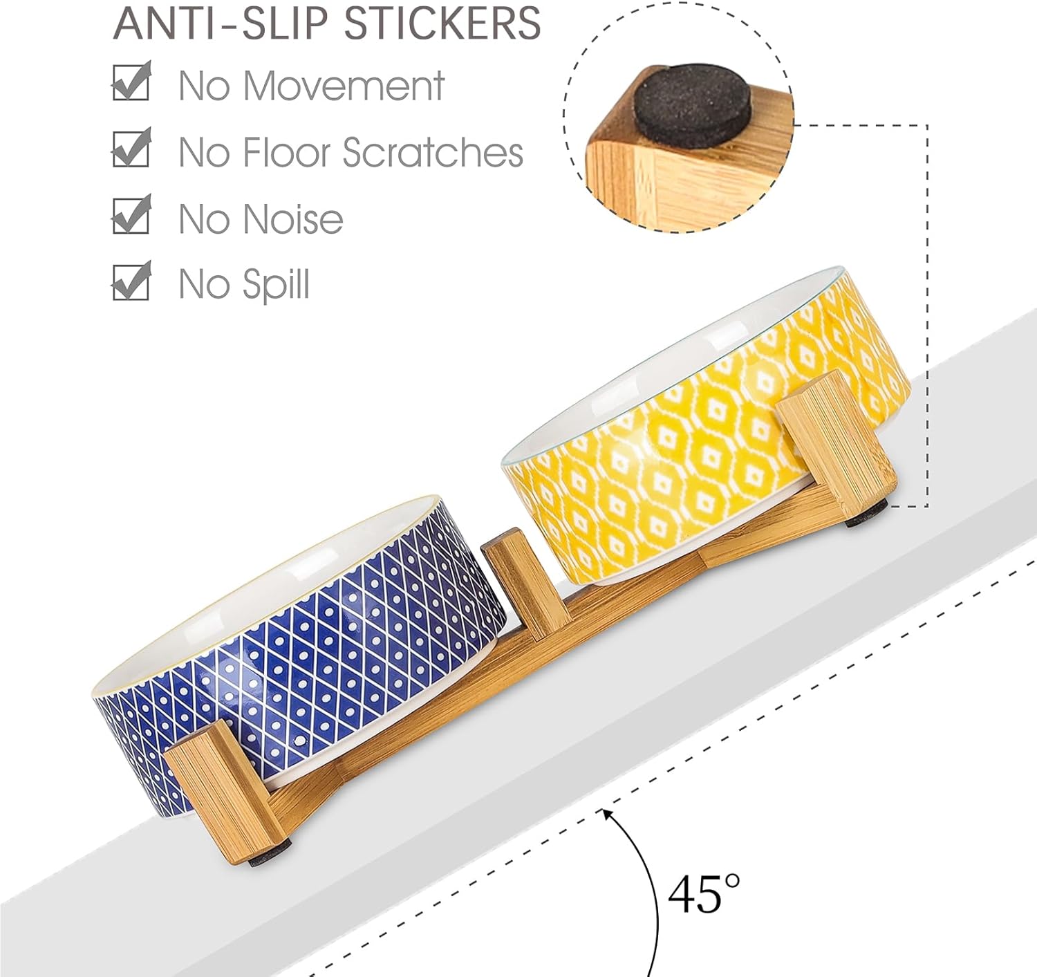 - NON-SLIP & ANTI-SCRATCHED WOODEN STAND BASE- Each pet bowl set is paired with Non-skid pads that can stick under the wooden stand and also avoid scratching the floor. This triangle stand has a certain weight base that can keep the dog bowls set to stay in place and never move around.