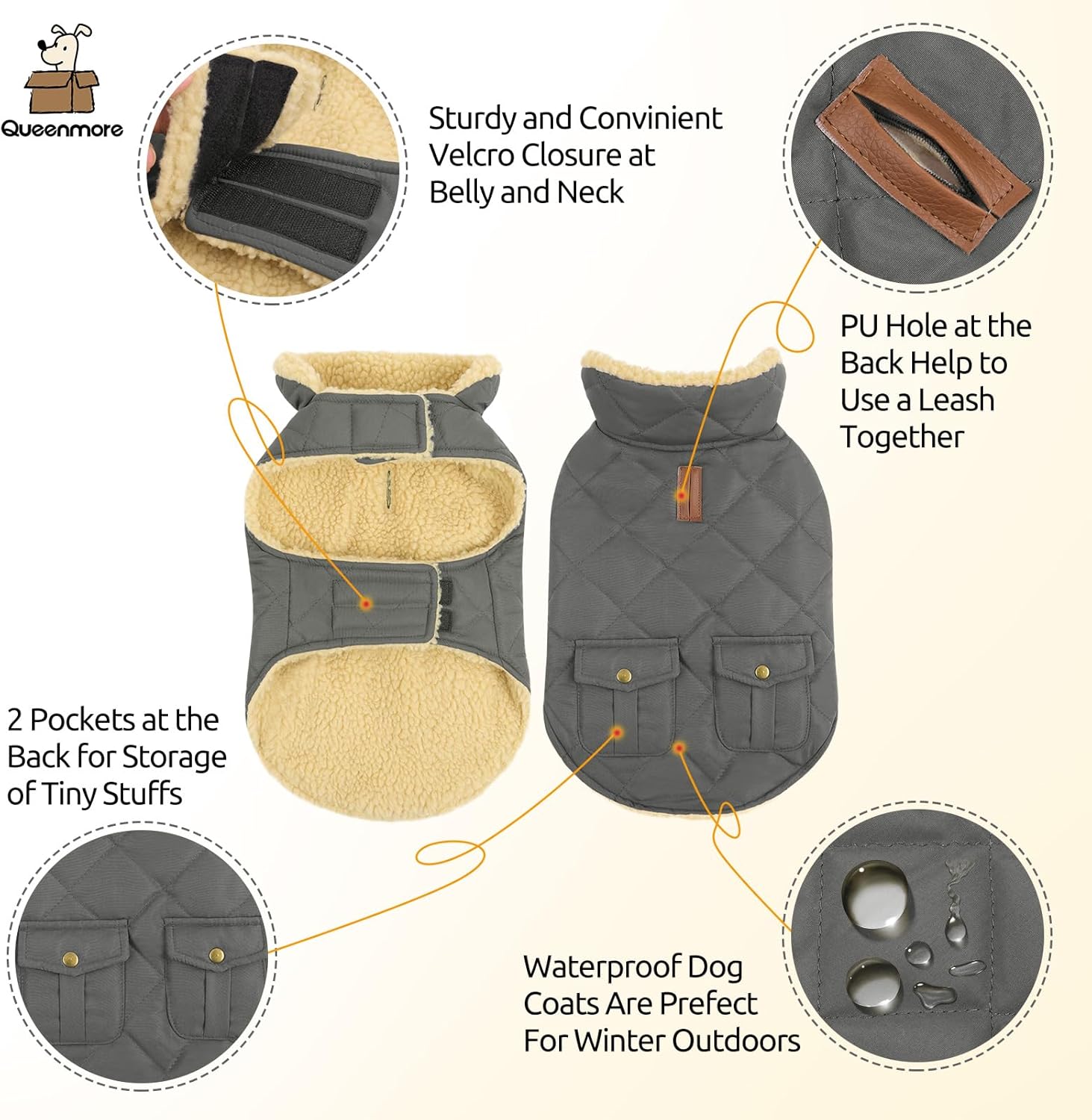 Queenmore Dog Winter Coat - Fleece Jacket, Waterproof Cold Weather Clothes, Thick Warm Cotton Padding, Easy On Storage Pockets (Grey, X-Large)