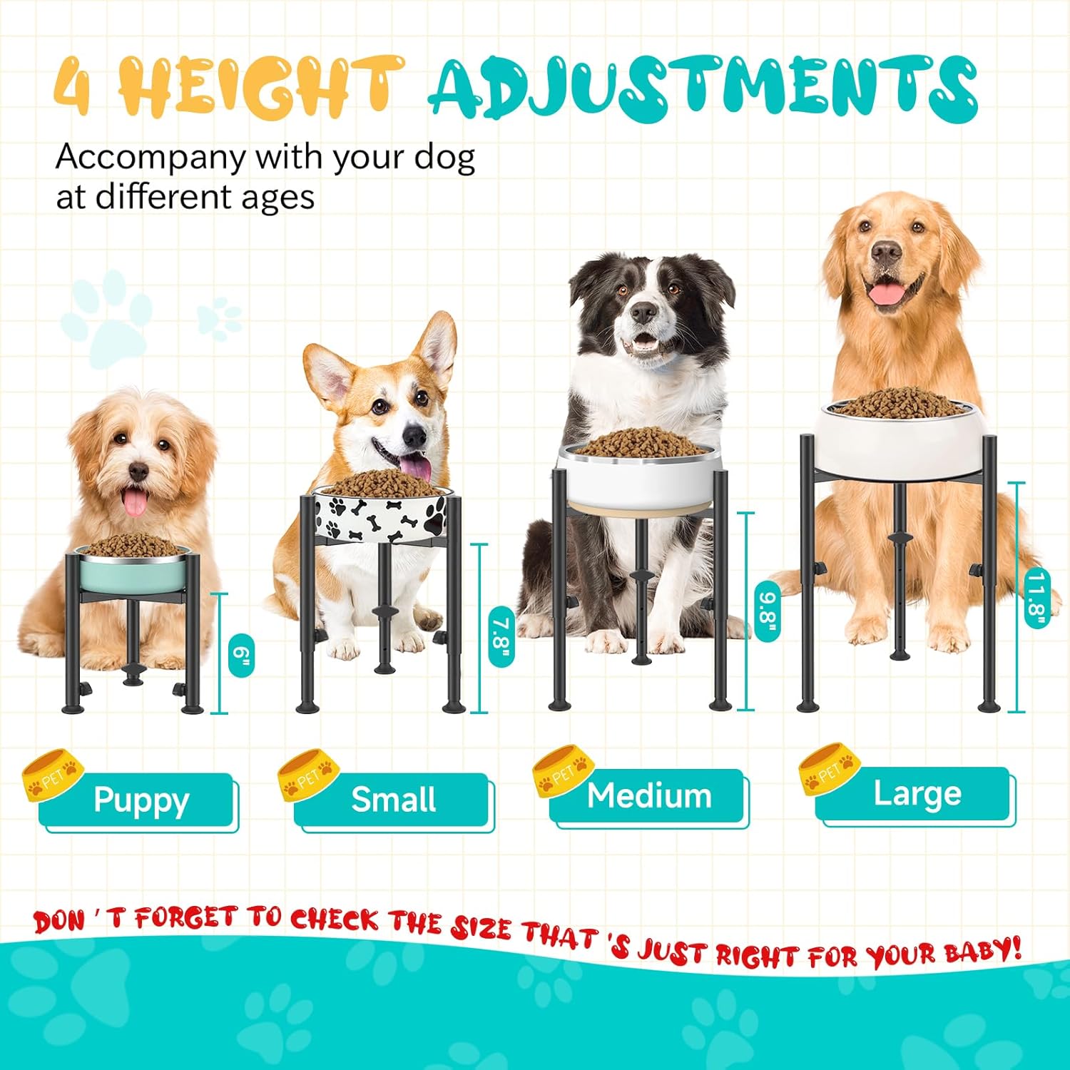 - Height & Width Adjustable Design: This elevated dog food bowl stand will accompany with your dog at different ages, with 4 adjustable heights(8β/10β/12β/13.8β),adjusted in width 6-10β, ensuring that your dog eats in a healthy and safe way at all times; Every time the height of the dog food bowl stand increases it means that the dog has grown a little bit more with you, what an unforgettable moment