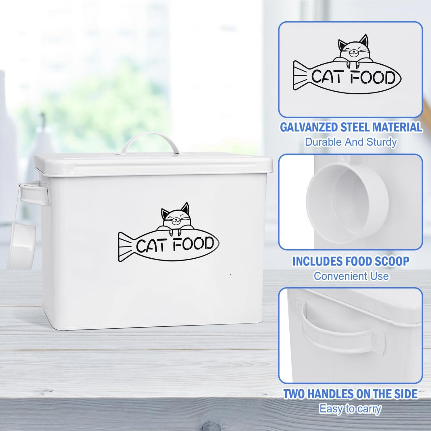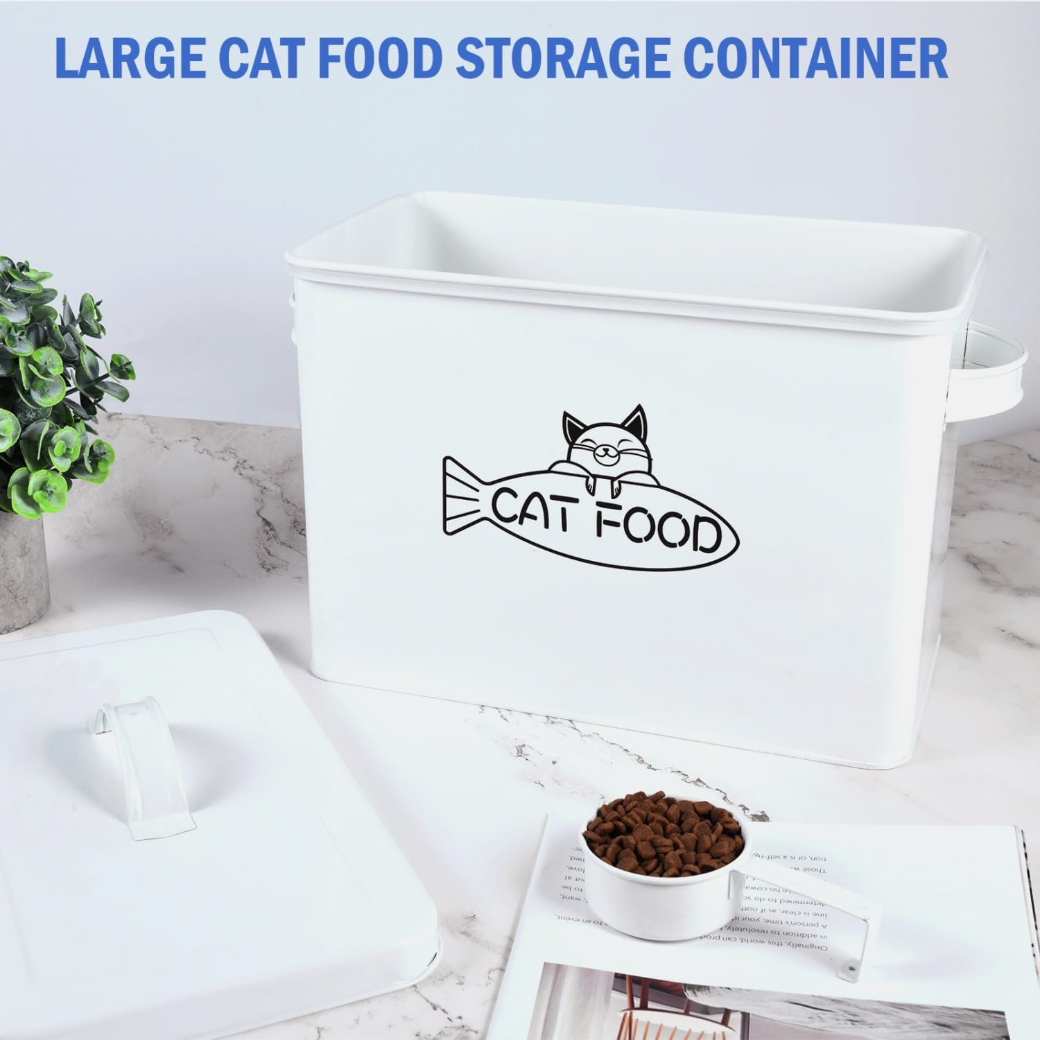 - β EASY TO USE: The cat food storage comes with a sturdy metal scoop that can hang on the side of the storage bin for conveniently transferring the food to dog's or cat's bowl. With metal carrying handles for easy to grasp when using it.