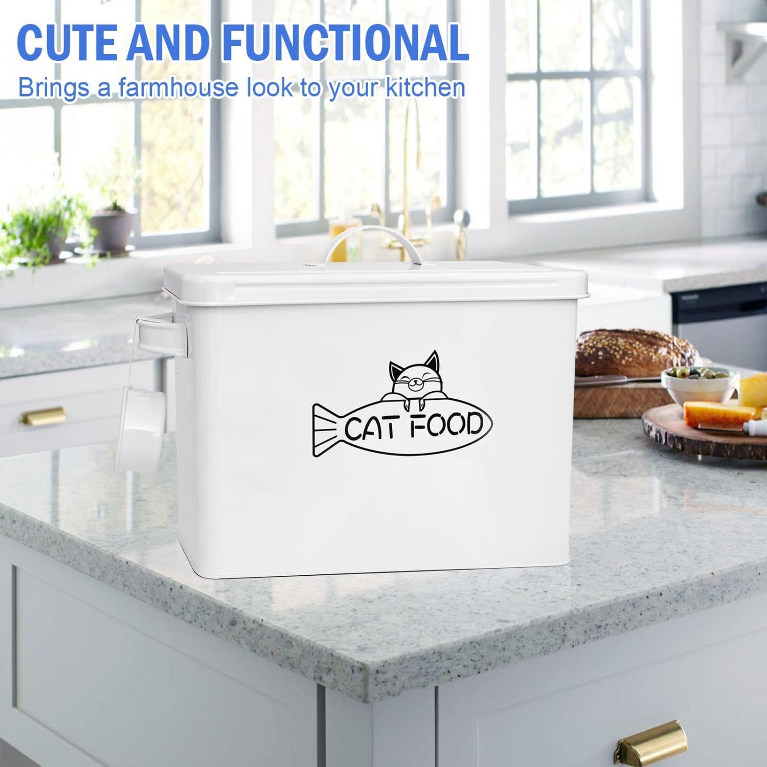 - β PRACTICAL & CUTE: No more dealing with unsightly cat food bags. Whether on display on your countertop, or store in your pantry, the cute cat treat container is an eye-catching focus. Add a touch of farmhouse style for your counter.