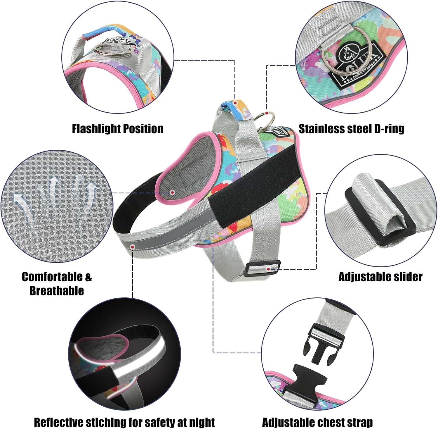 - STURDY HANDLE: The adjustable dog harness with rugged nylon handle further enhances your distance from the dog and is more intimate with each other. Easy on dog harness is also the best partner for dogs and is easy to control your dog.