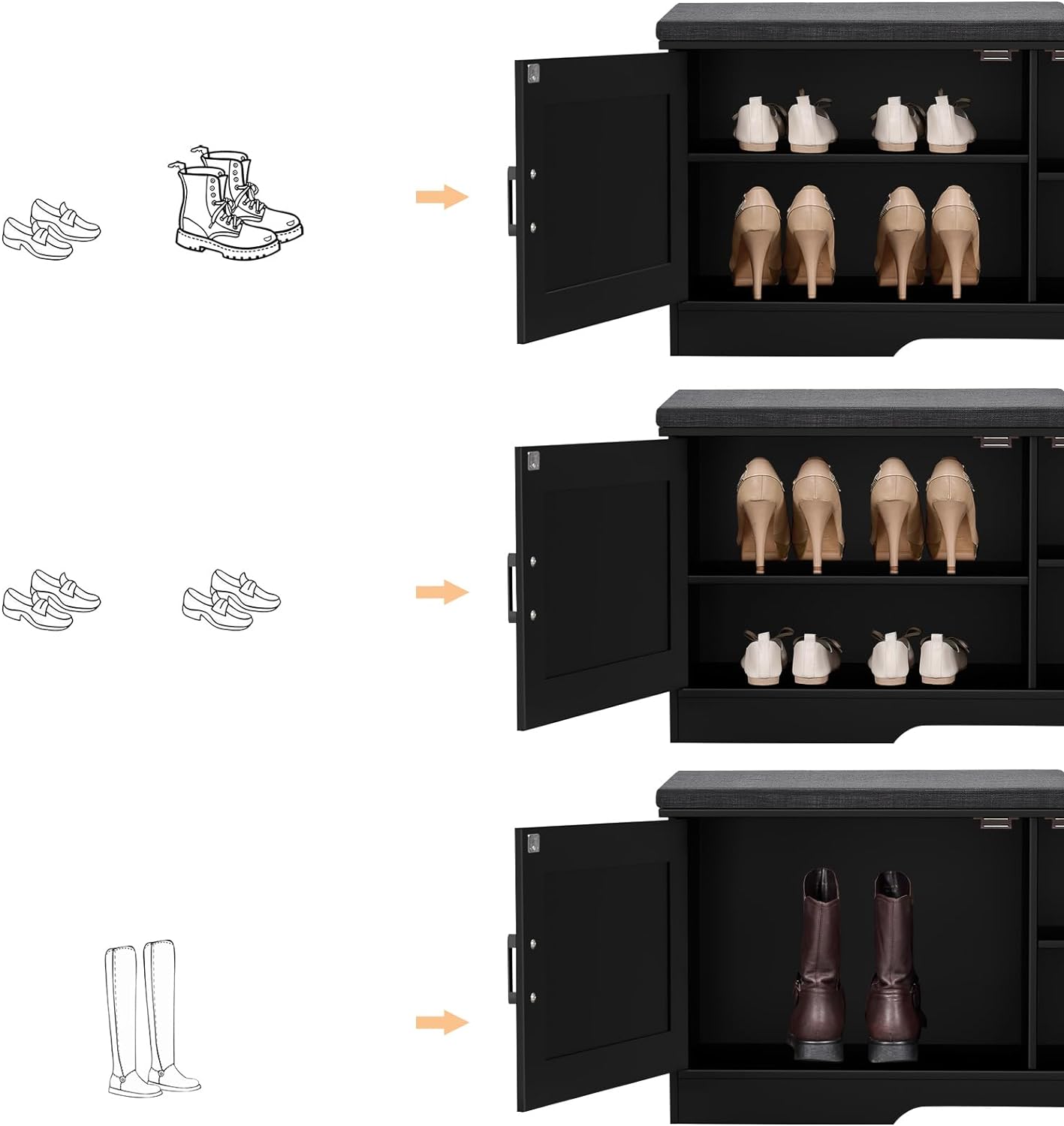 - Keep Your Shoes Organized: The depth of bench is 13.8 inches, which makes it easily to put in your shoes, meanwhile shoes of various heights can be placed by adjusting middle movable boards. The bench doors design ensures not only your privacy, but also a tidy space