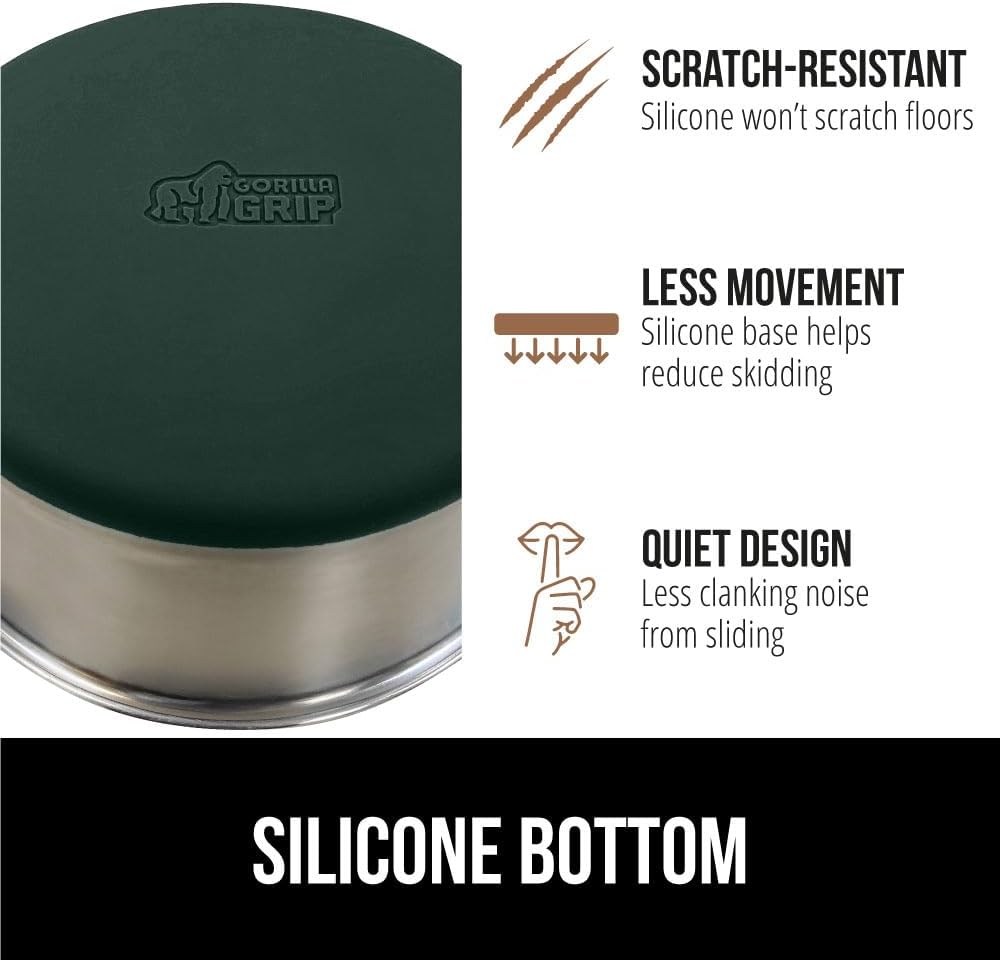 - SILICONE BOTTOM: the Gorilla Grip bowl is constructed from durable silicone that helps keep the bowl steady and wonโt scratch your floors; while some over eager eaters may still be able to slide the bowls, the silicone will help prevent much movement; plus, it reduces the noise from clanking and sliding across wood, tile, and more