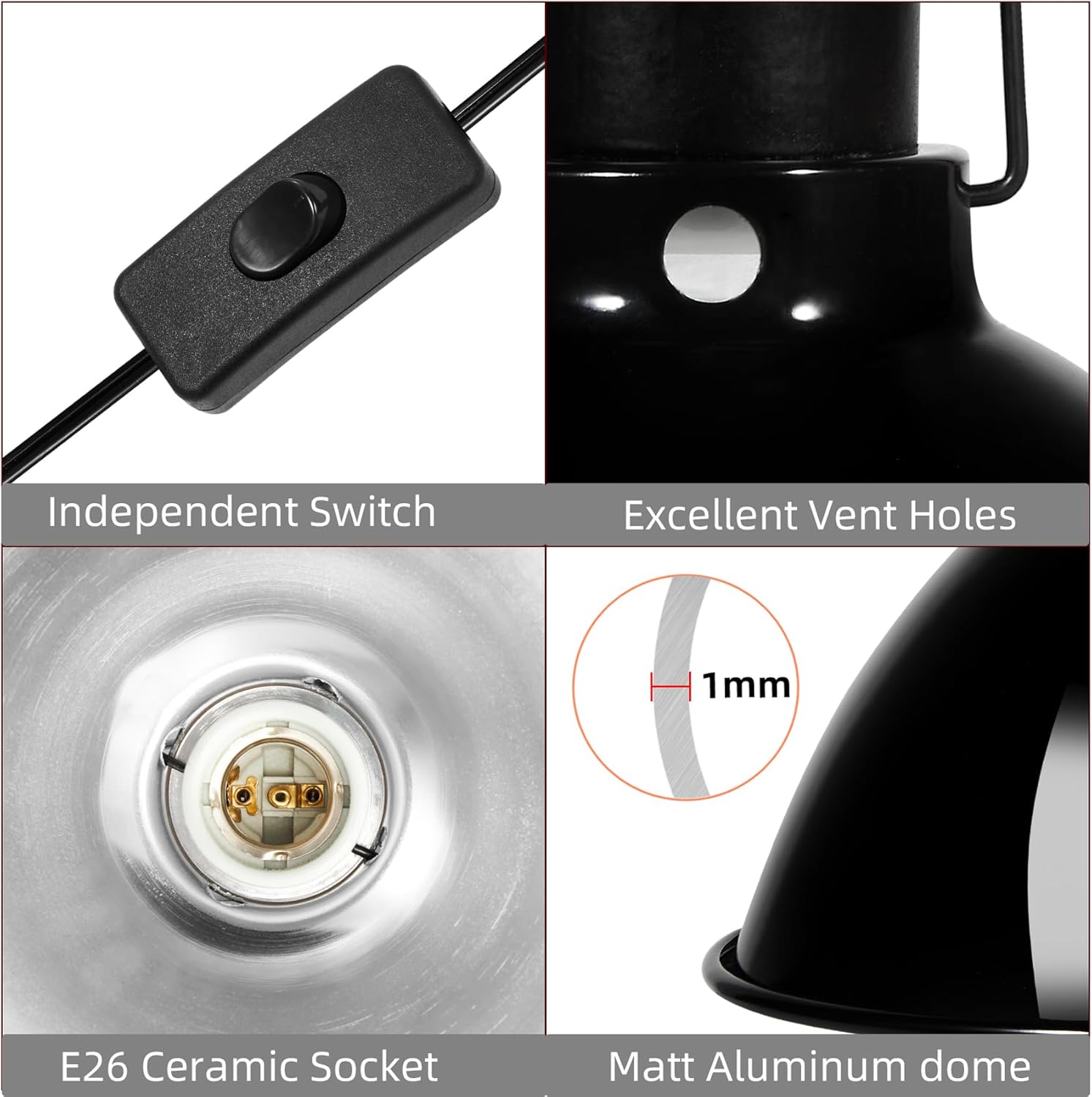 - 【Ceramic Heat Lamp&Max 150W】:The 8.5inch dome reptile heat lamp fixture is rated at a maximum of 150 watts and has an E26 ceramic socket. The ceramic lamp head offers good heat resistance,making it suitable for most reptile heat lamp reptile bulbs; you can match different reptile heat lamps meet the needs of pets.
