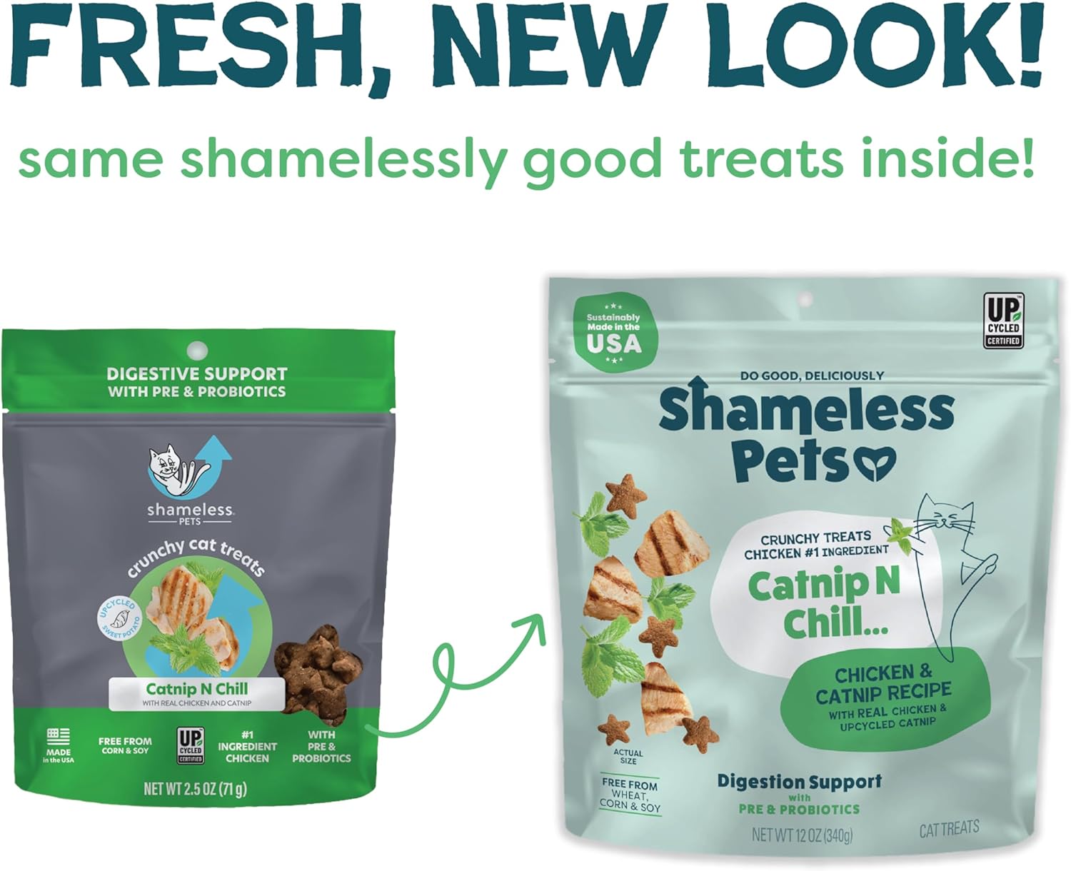 - Cat Treats That Support Digestive Health: Chillin has never been easier or tastier with our new large size bag of fan-favorite cat treats! Our fresh Shameless Pets Crunchy Cat Treats (Catnip N Chill) may cause a little fun followed by a trip to the couch. These crunchy, star-shaped, bite-sized treats are made with chicken, sweet potatoes, catnip and packed with both pre & probiotics, which help support digestion! Includes one 12 oz bag.