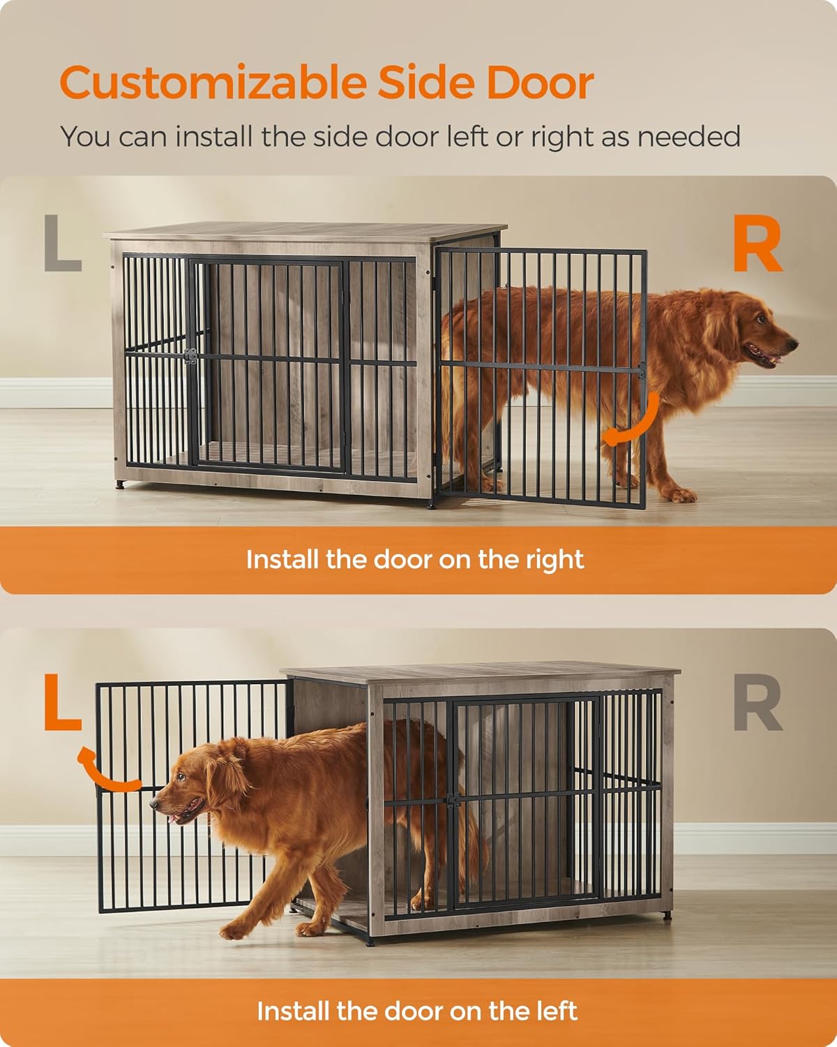- [Door Left, or Door Right] You decide. This dog cage comes with 2 doors (1 front door and 1 side door) for your dog to go in and out easily; the side door can be either installed to the left or right to fit various spaces
