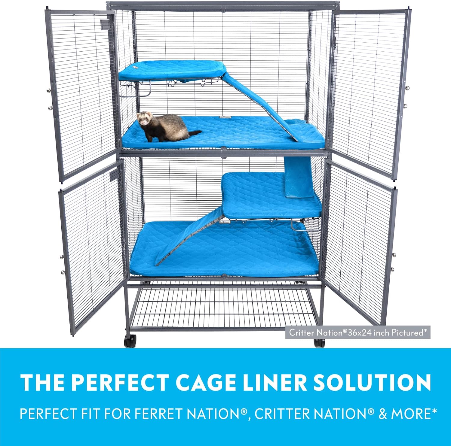 - PERFECT FIT: Designed specially for use with the Ferret Nation and Critter Nation* double unit cage. A stretchy elastic bottom makes the liner easy to put on and secure over the trays, and two flexible wide straps reinforce the liner for a perfectly tight fit. The top pan includes a cut-out for the ramp opening. The ramp covers slide on to the ramps and are secured with a strong hook-and-loop (velcro) closure.
