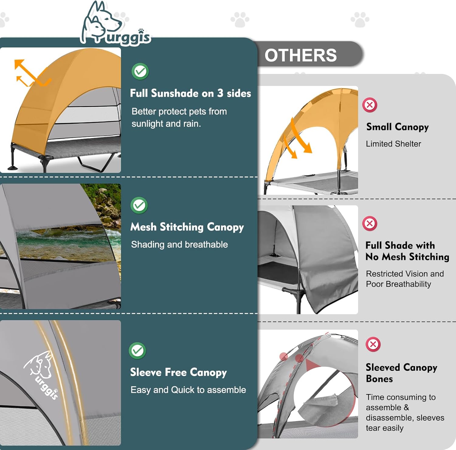 - Elevated Pet Cot With Anti-Scratch Breathable Bed Mat: Features a high density teslin breathable meshing bed mat, this bed is anti-scratch, breathable and odorless, no sticking hair and can be easily cleaned up by wiping or hosing off and keep clean. With this elevated dog bed with a large canopy, our furry kids will be better protected from ground heat and scorching sun in summer and keep dry in light rain (cover is recommended in heavy rain), let them have a cozy summer!