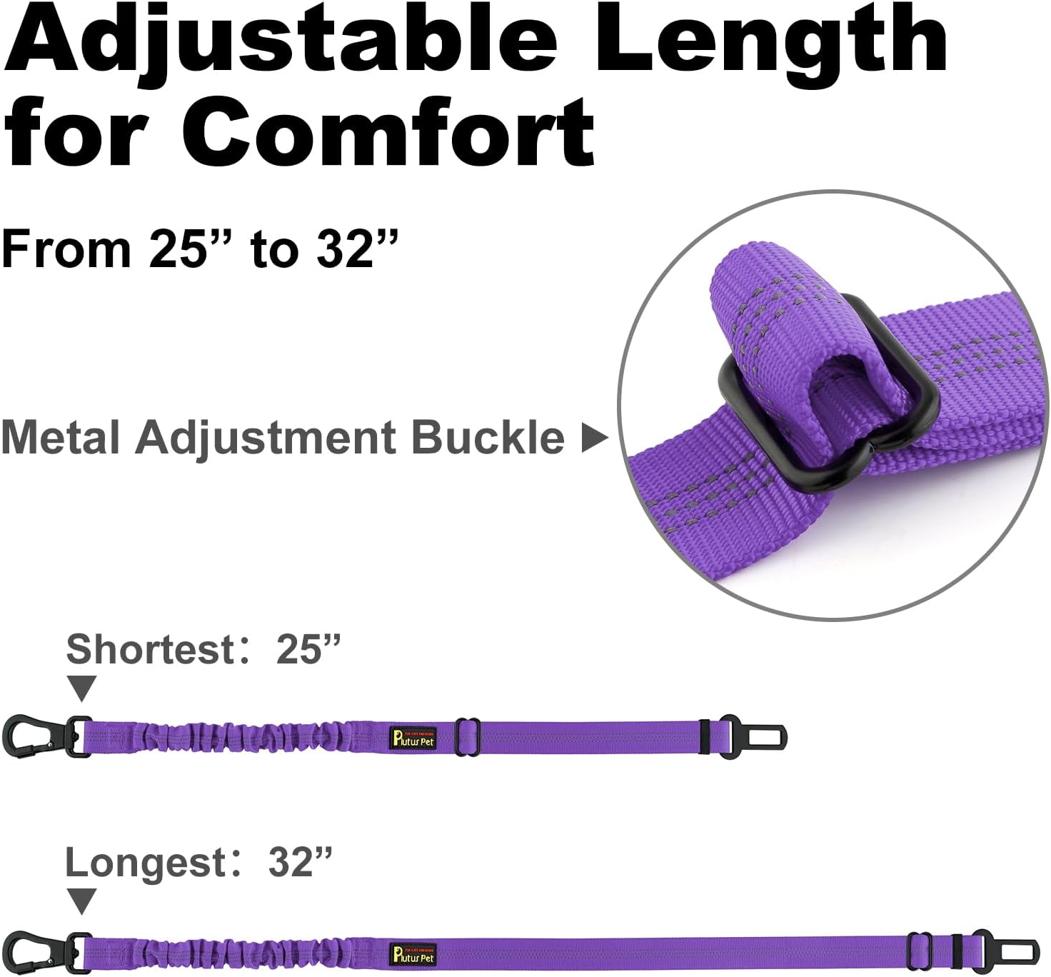 - Adjustable Length for Comfort. Our dog seat belt is designed with adjustable length, providing a custom fit for dogs of all sizes. The seatbelt can be adjustable from 25 to 32 inches. Whether you have a small pup or a larger breed, our dog seat belt ensures a perfect fit, keeping your pet secure and content.