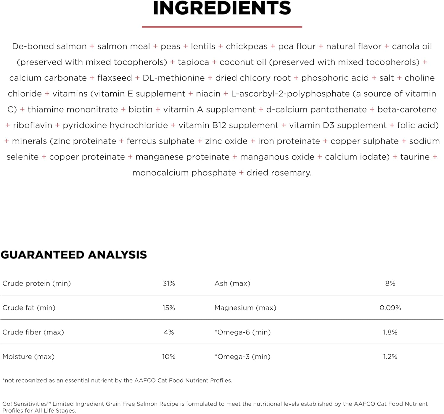 - LIMITED INGREDIENTS FOR SENSITIVE CATS: Go! Solutions Sensitivities recipes are thoughtfully crafted for cats with sensitive stomachs and food allergies using minimal ingredients while meeting nutritional needs