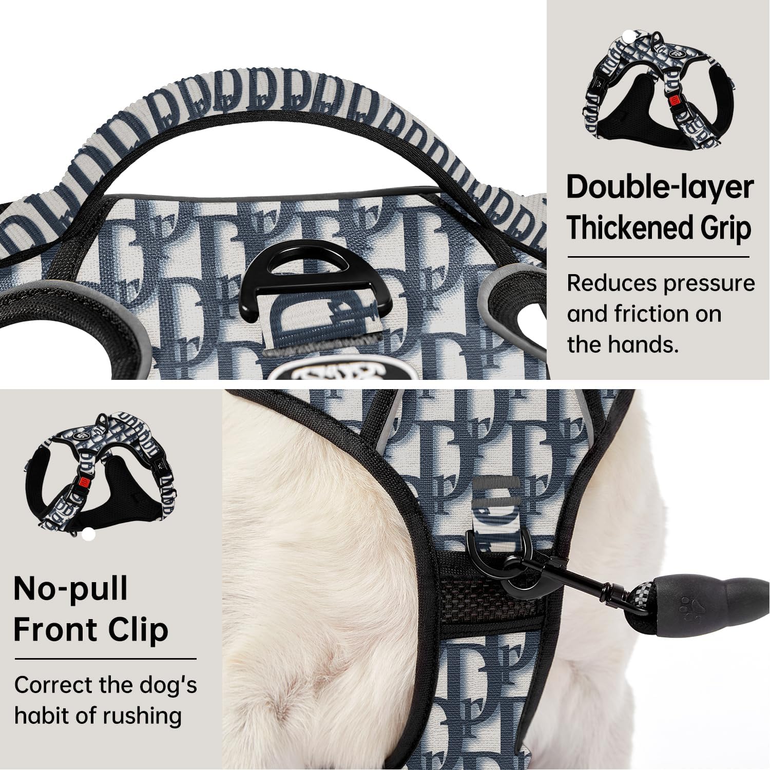 - ≡ FRONT & BACK CLIPS ≡By limiting the dog's walking direction, using the front clip will stop the dog from pulling(of course, you can also hang the dog tag on it) . Both 2 clips are made of alloy material with one-piece molding process. The connection between the clips and the fabric has also been strengthened in multiple ways to ensure that the dog will not get out of control
