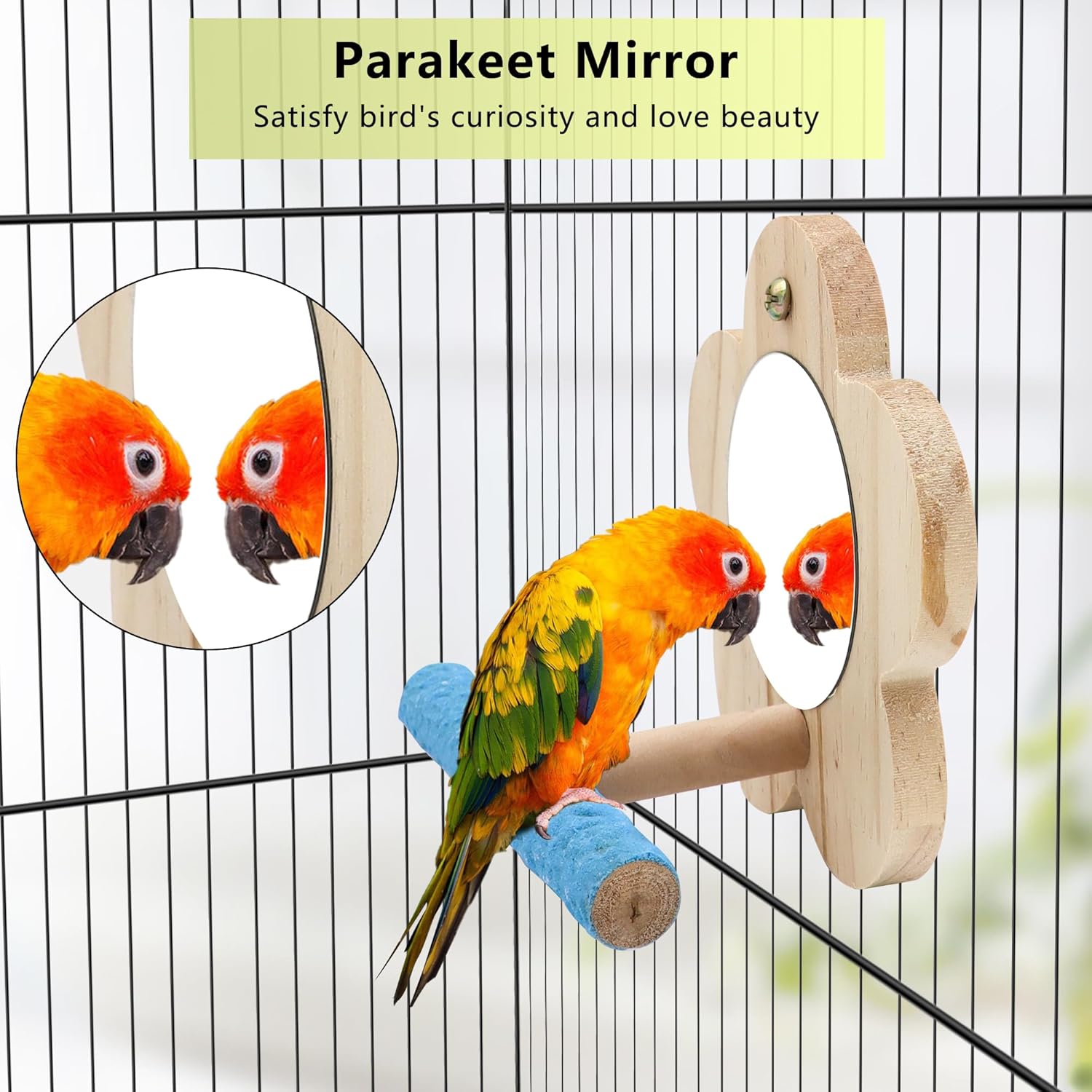 2Pcs Small Bird Mirror Parrot Swing,Wooden Parakeet Perches Flower Interactive Play Toys for Small Budgies Macaw African Grey Parakeets Lovebird Cockatiel Cage Accessories (S,Wood-2p)