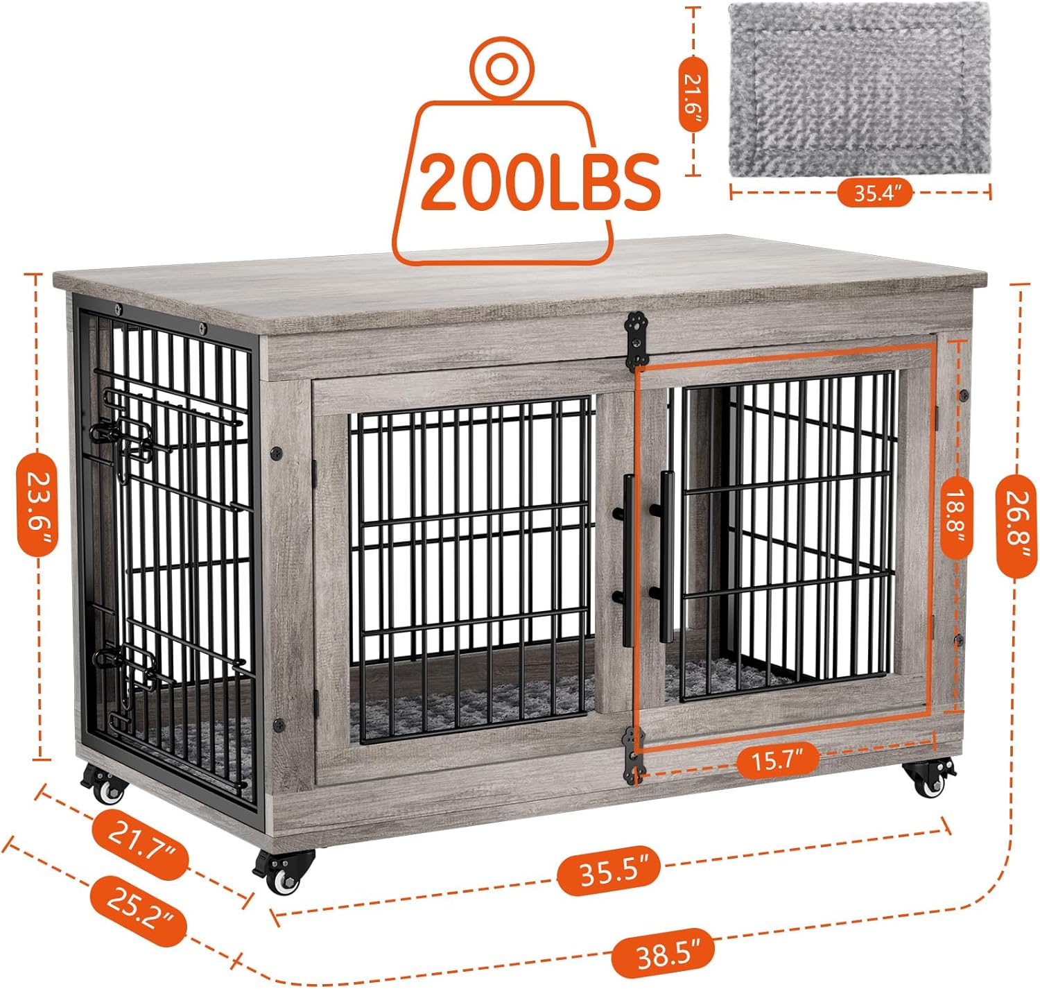 Lulive Large Dog Crate Furniture, 38'' Wooden Dog Crate End Table, Double Door Dog Kennel Indoor with Cushion & Wheels, Decorative Dog Cage House Chew-Resistant for Large/Medium, Grey