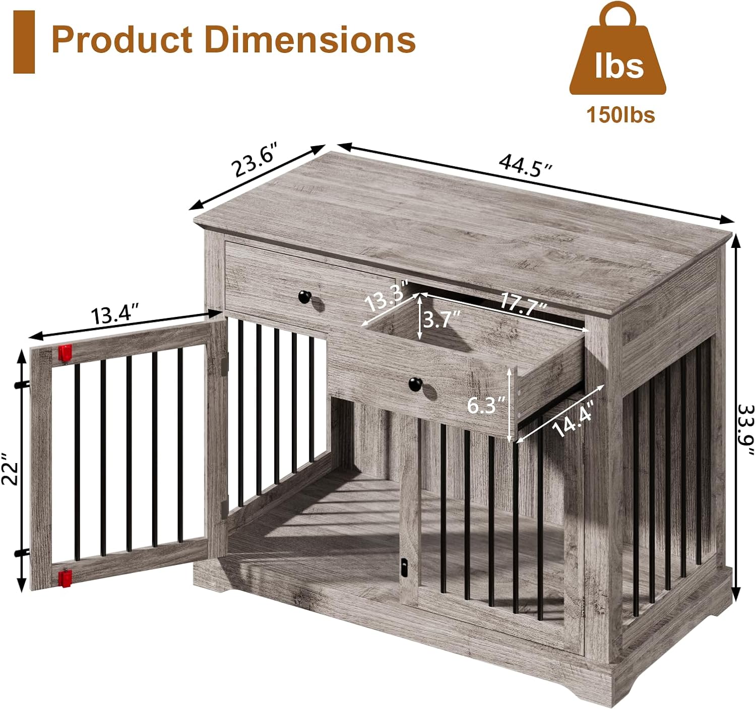 PUKAMI 44inch Dog Crate Furniture with Drawers,Wooden Dog Kennel Furniture for Large Breed,End Table Wood Dog House for Indoor use (Grey)