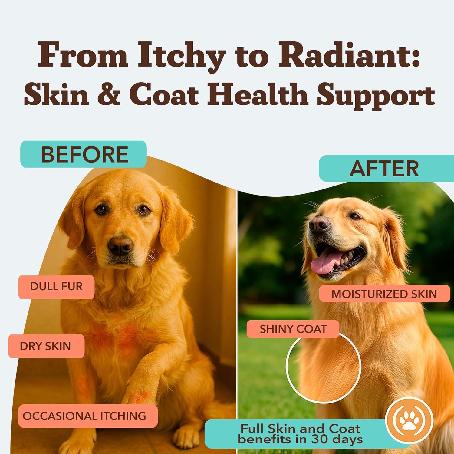 - PROMOTES COMFORT FROM OCCASIONAL ITCH: A balanced Omega 3-6-9 blend supports skin barrier hydration to help relieve occasional itch and irritation caused by dry air, grooming, or environmental sensitivities, keeping your pup calm and comfortable.