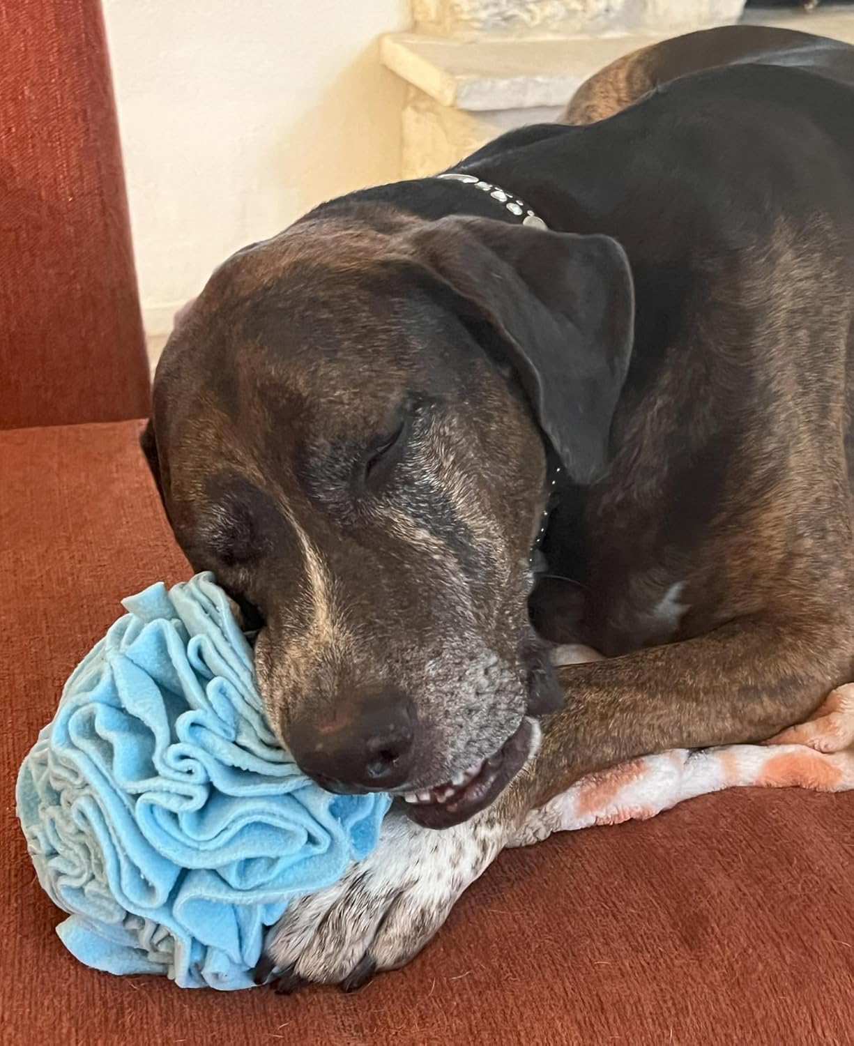 - It’s a snuffle mat reimagined for medium to large mouths. This hide-and-seek toy is a great way to keep your dog engaged and occupied while also helping them develop their sensory skills looking for hidden treats as a reward during playtime! Folds of soft polyester fleece fabric hold small treats or even kibble for way-sensitive noses to sniff out and discover, hitting puppy paw-fection: play, forage, and reward.