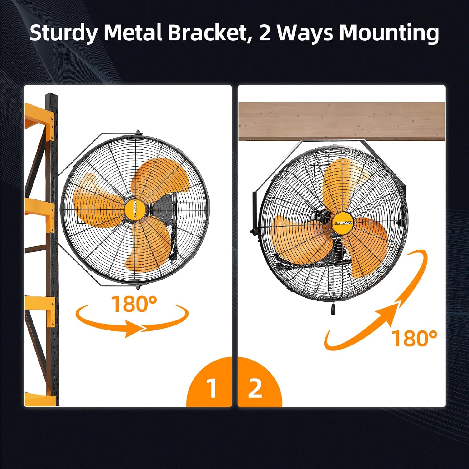 - 2 WAYS MOUNTING - You don't need to assembly the fan, using new bracket made out of power-coated steel construction hang the fan on the wall or the ceiling. This Industrial wall fan can tilt a full 180Β°, just switching the adjustment knob to direct air exactly where you need it.