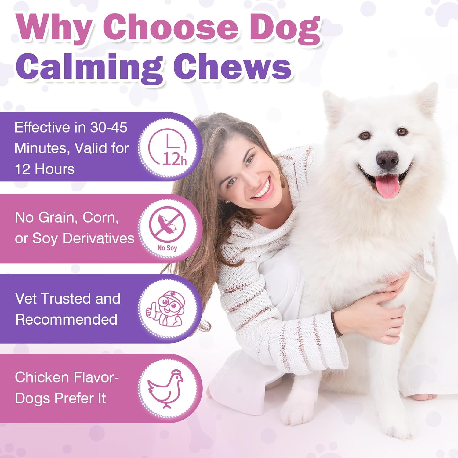 - [Chicken Flavored Calming Dog Chews] Dogs love the chicken flavor of calming treats for dogs, and the unique flavor makes calming chews for dog a favorite treat for dogs. The taste of chicken stimulates dog's appetite, ensuring dog is willing to enjoy hemp calming treats for dogs. With calming hemp chews for dogs, no need to force pet to swallow dog anxiety medication. Your furry friend will love delicious chicken-flavored calming for dogs treats. Dog will enjoy hemp calming chews, like snacks
