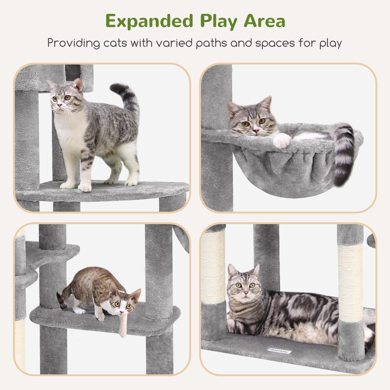 - STABLE STRUCTURE: This cat tree tower utilizing a trapezoidal design with multiple support points enhances stability, making your cats feel secure during playtime.