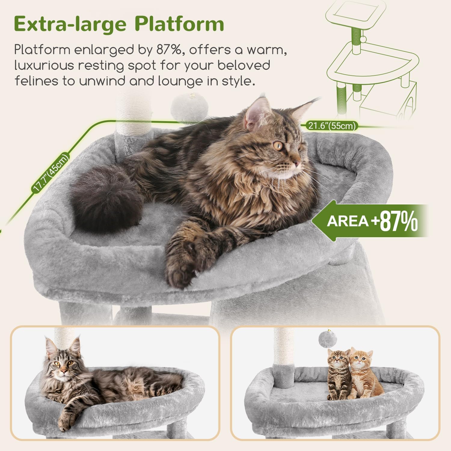 - EXTRA-LARGE PLATFORM: F83 cat tree designed with a 55x45cm fan-shaped platform, offering ample space for activities, allowing adult cats to comfortably observe their surroundings or stretch their bodies.