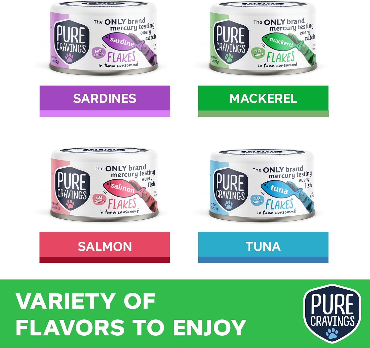 Flakes in Tuna Consommé, Canned Wet Cat Food Soup, 100% Mercury-Tested, Moist Can Fish, Grain-Free Protein, Non-GMO, 3oz, Variety Pack 3X Tuna, 3X Salmon, 3X Sardine, 3X Mackerel