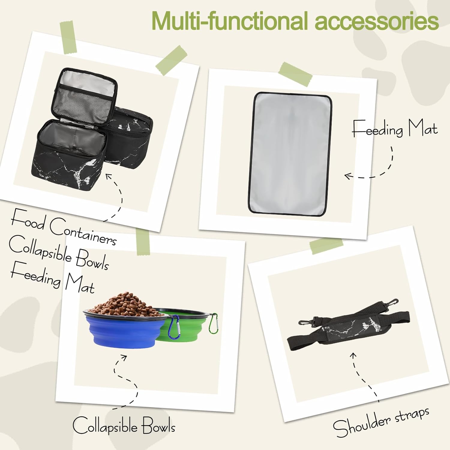 - 【Travel Bag For Dog Kit Include】: 1 Dog Tote bag, 2 Dog Food carriers bag, 1 Water-Resistant Placemat, 2 Pet Silicone collapsible bowls (The colors of the bowl are randomly matched). This dog travel tote bag is the ultimate food storage and supply gear for any trip.