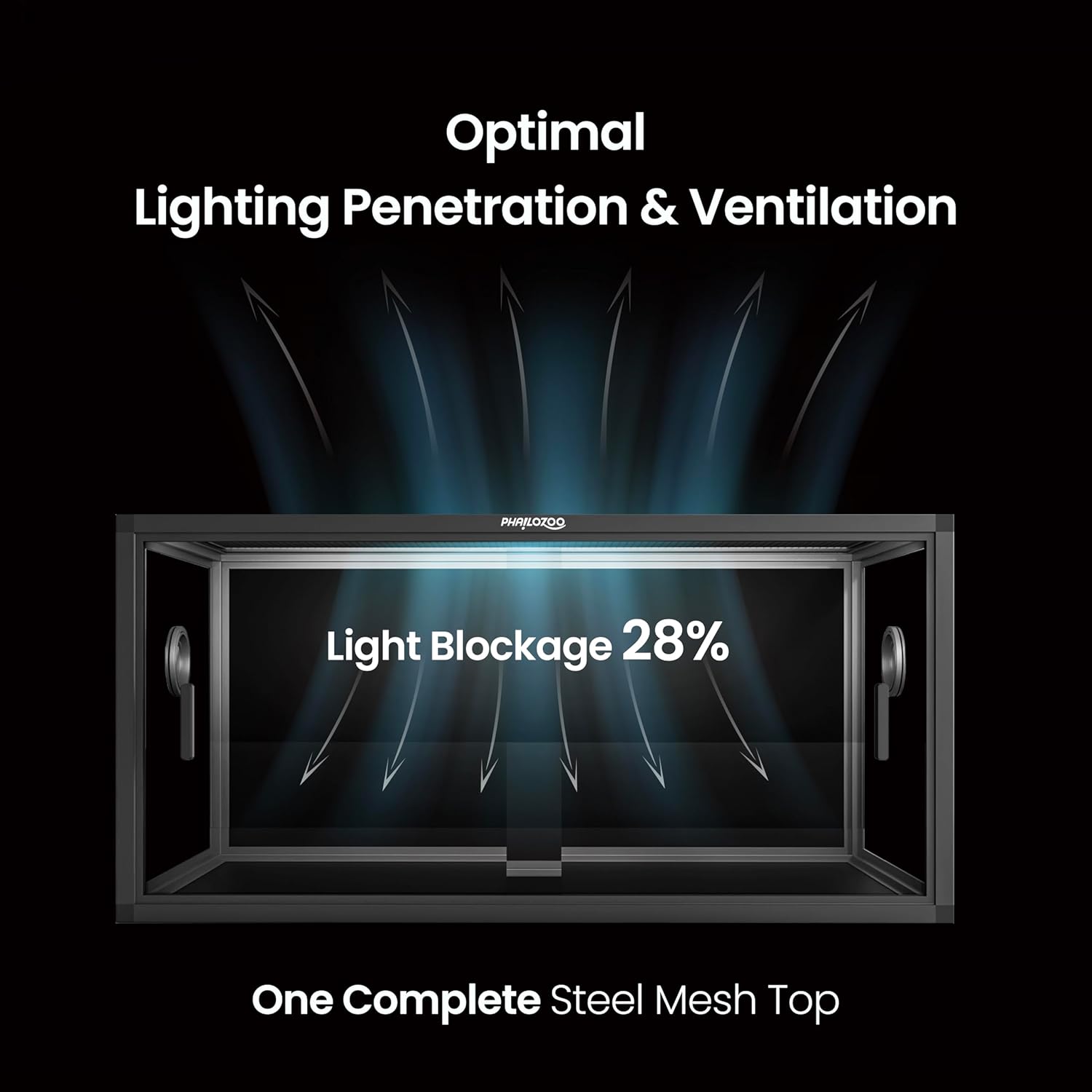 - ăHighly AdaptiveăWell-lit screen top with only 28% blockage. Compatible with many reptile accessories and equipment, such as heat lamps for reptiles, reptile humidifiers, reptile misters, reptile foggers, reptile UVA and UVB. Our reptile terrarium is great for holding temps and humidity.