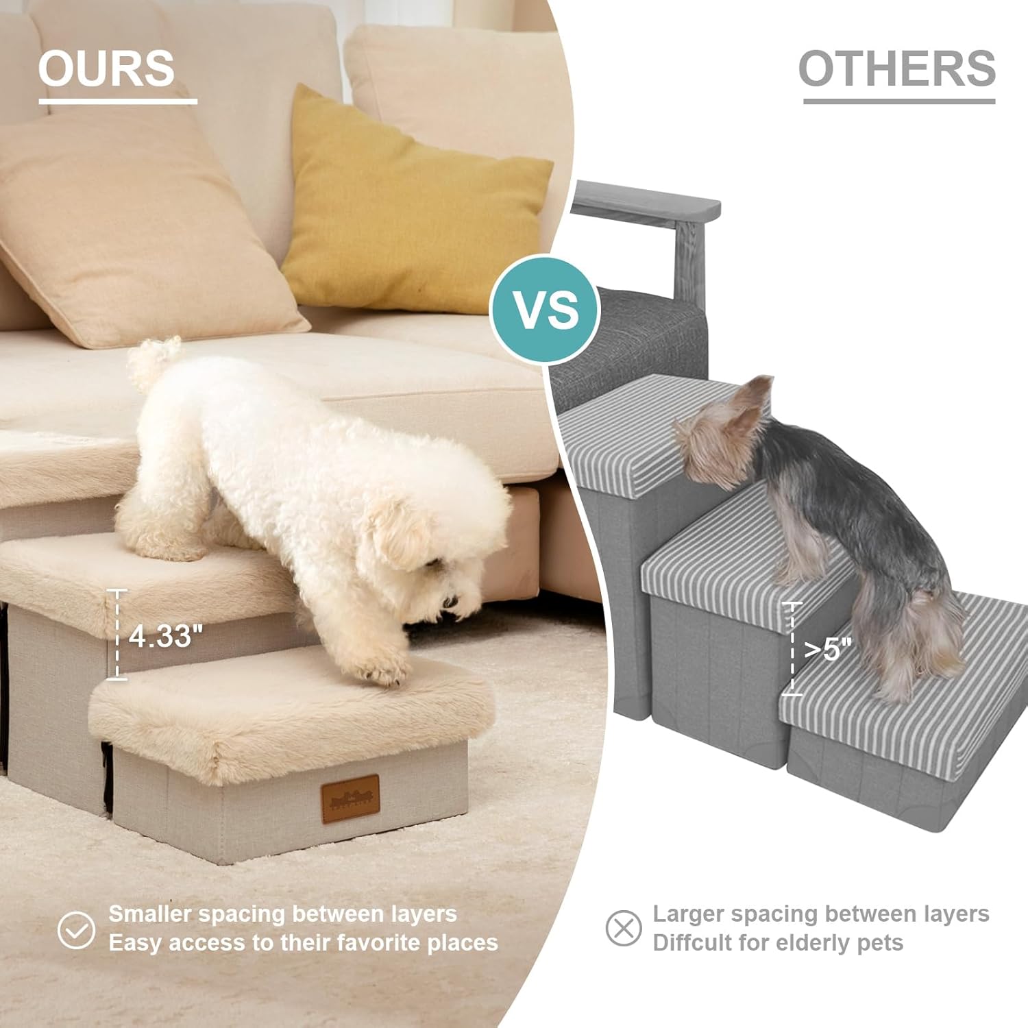 - 【Dog Stair with Storage】NOTE: The stairs are designed for small pets. Each step features a convenient storage space, perfect for storing pet toys, clothes, snacks, and any other pet supplies or accessories. Each step is less than 5 inches high, making it especially suitable for puppies or pets with knee injuries. NOTE: Be sure to verify that the size of the dog stairs is appropriate for your needs before purchasing.