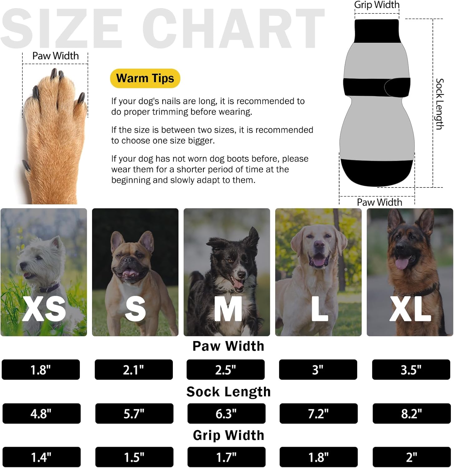 - SIZE GUIDE: S-Paw width 2.1in, sock length 5.7in. If the paw width is between two sizes, please choose the larger size. Includes 6 dog grip socks (two more available for replacement than other sets).