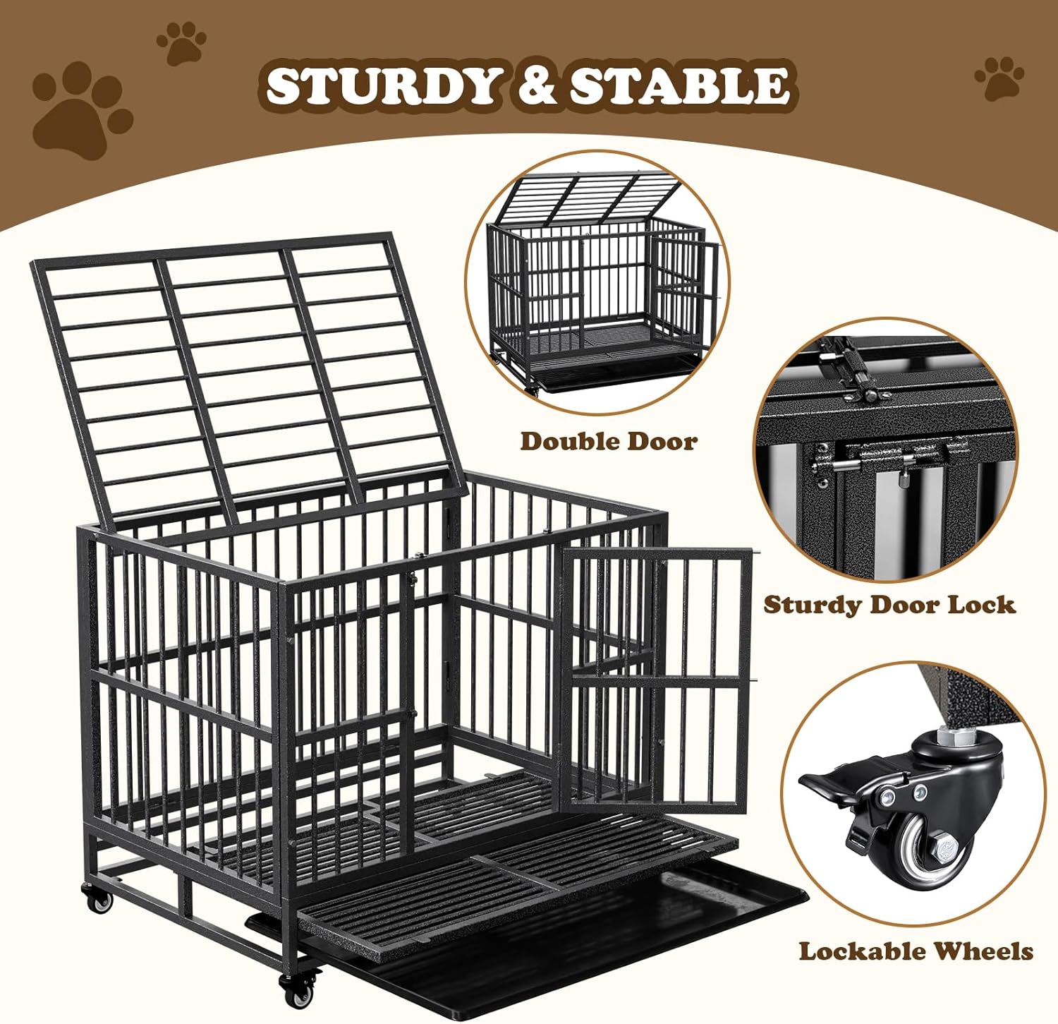 - Spacious & Comfortable Design: With ample interior space, this dog crate cage provides plenty of room for your pet to move, stretch, and relax. The removable tray makes cleaning quick and effortless, while the smooth, rounded edges ensure your dogโs comfort and safety.