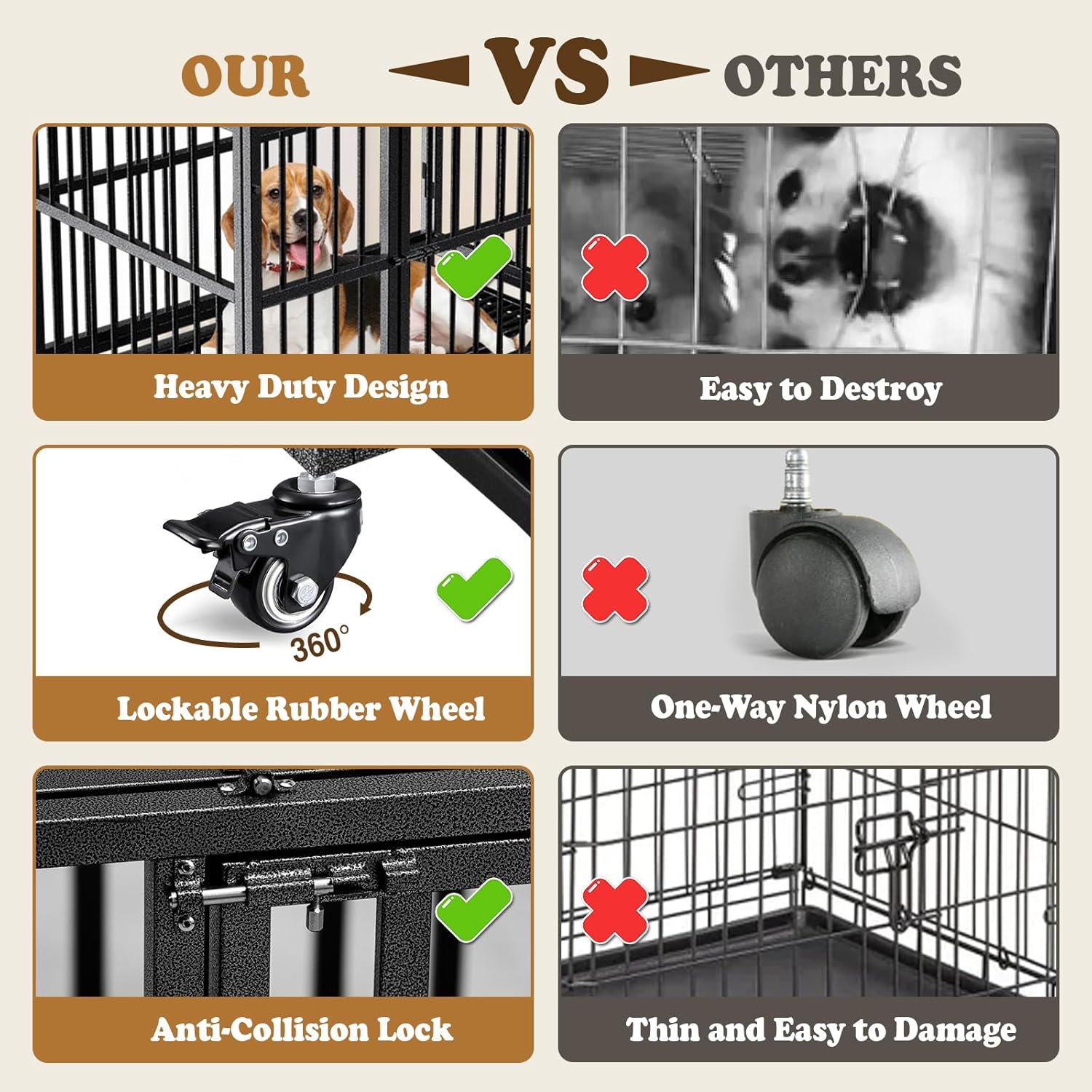 - Easy to Move: Equipped with 360-degree lockable rolling casters (including 2 lockable wheels), this heavy-duty indestructible dog kennel can be easily moved and secured for enhanced stability.