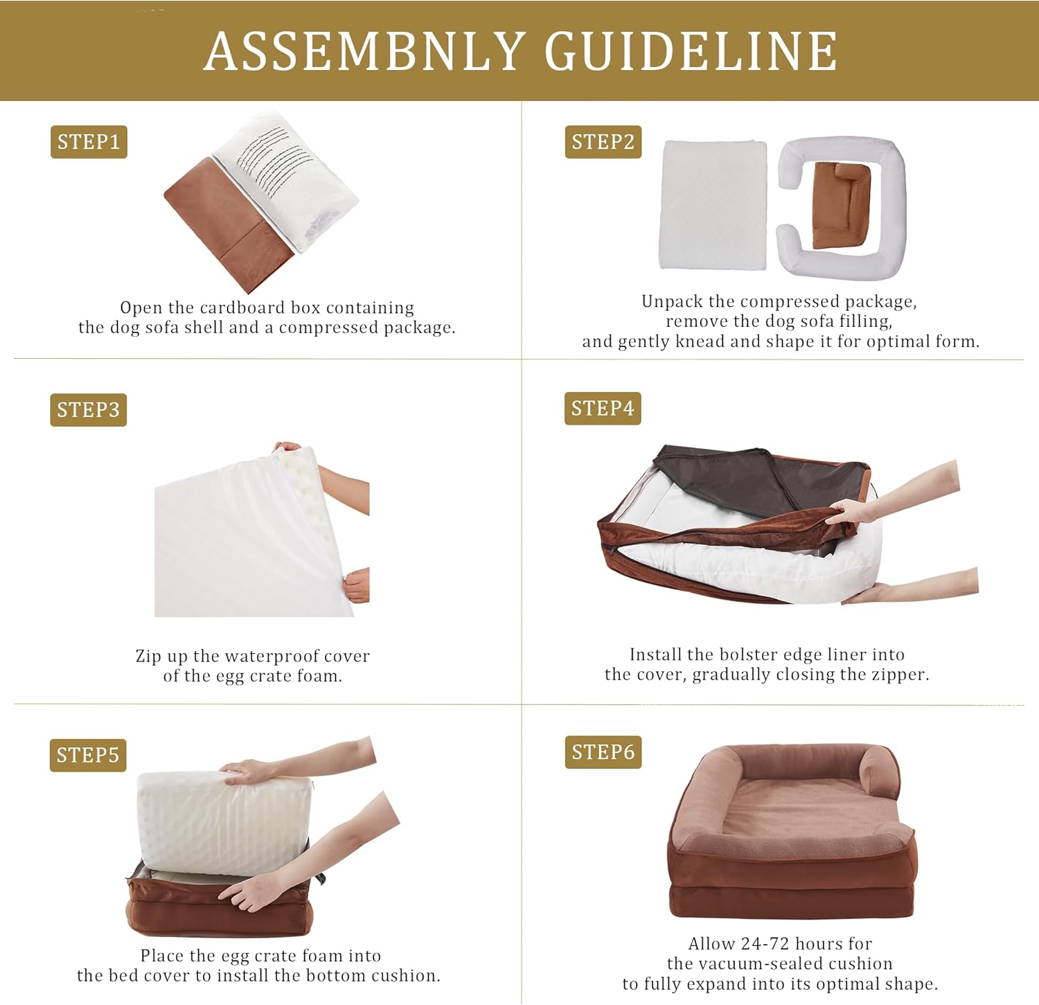 - Suitable Size: Suitable for All Breeds: 38"W x 28"L x 6.5"D; Sleeping surface: 30.5"W x 24"L (Up to 70lbs); When selecting the product size, please pay attention to the sleeping area. Please wait for 48 hours for full expansion to ensure optimal height and comfort before using.