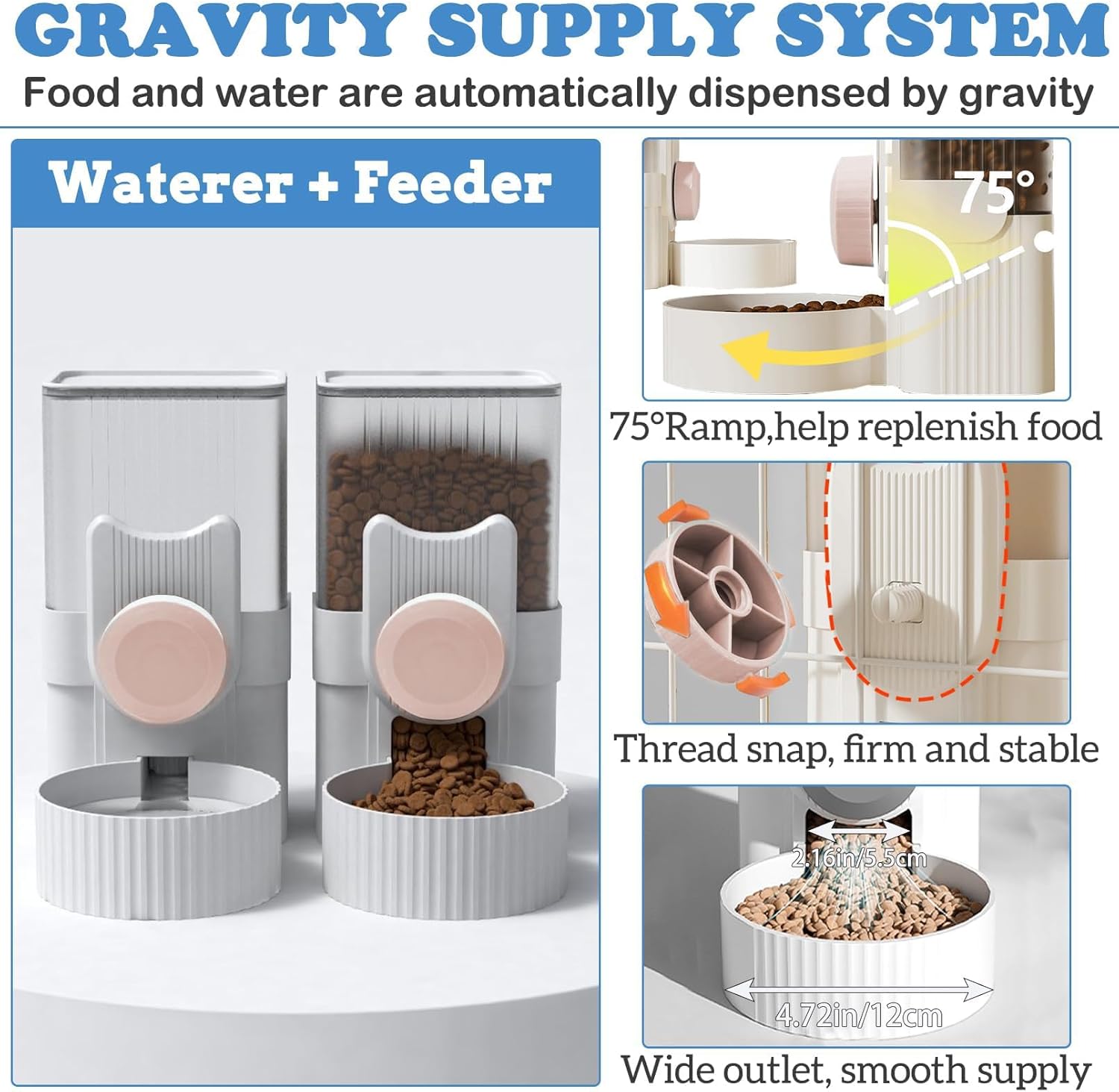 - And this rabbit food water dispenser has a 2.16-inch food outlet and a 75Β° inclined ramp that allows food to be fed smoothly into the bowl and prevents food clogging