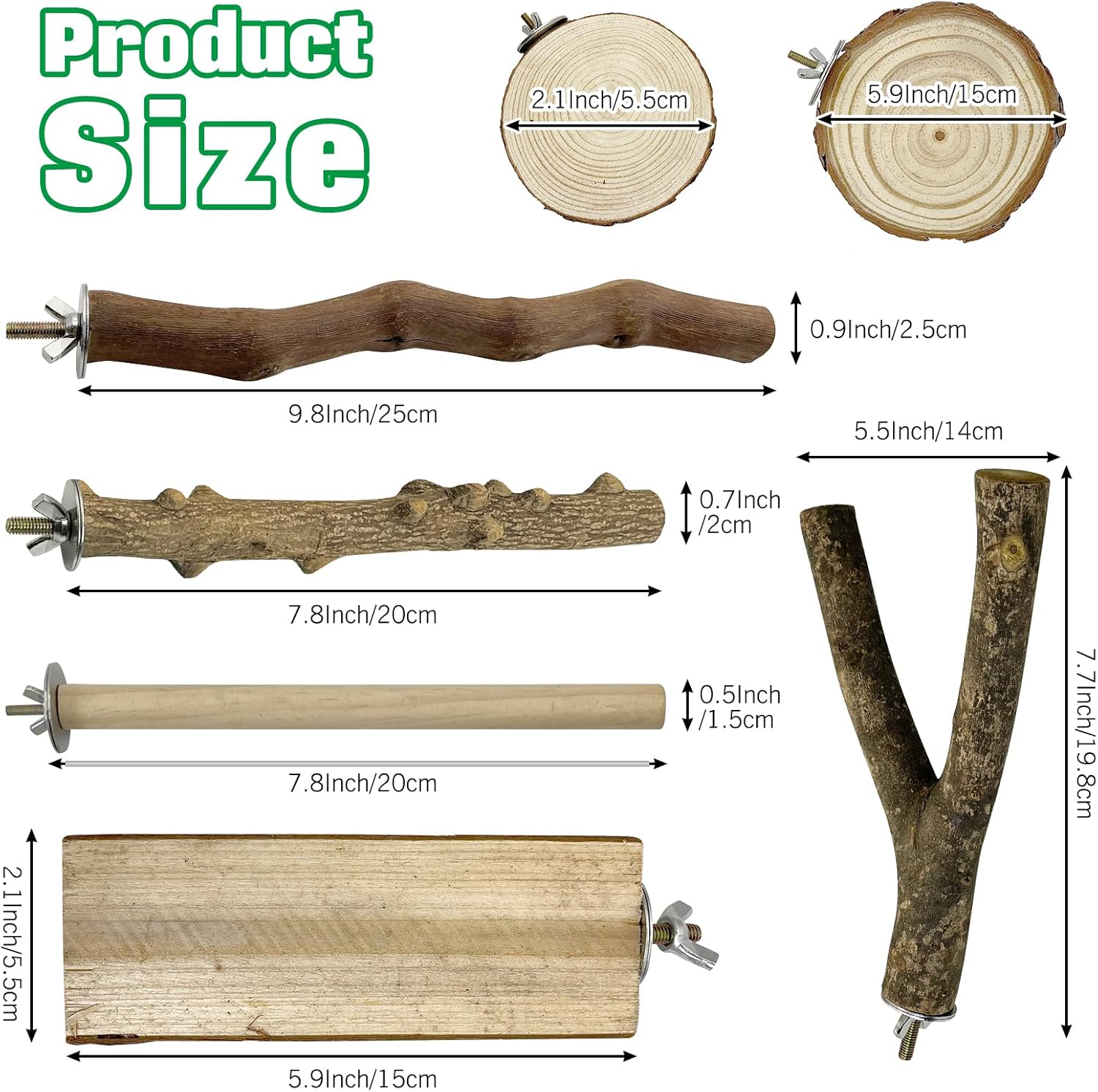 - WIDE VARIETY: The bird perches set includes 1 Clawed Fork perch, 6 parrot perches, 2 round platforms and 1 square platform. A sufficient number of wooden parrot perch are available for daily rest and recreation of birds. With these 6 types of perches, you can create a natural habitat for your feathered friends to live as they would in nature. The natural wood bird stand attract your pet bird's attention and are suitable for parrots to exercise, stand, climb, play, chew, rest and more, making it an ideal present for your avian companion