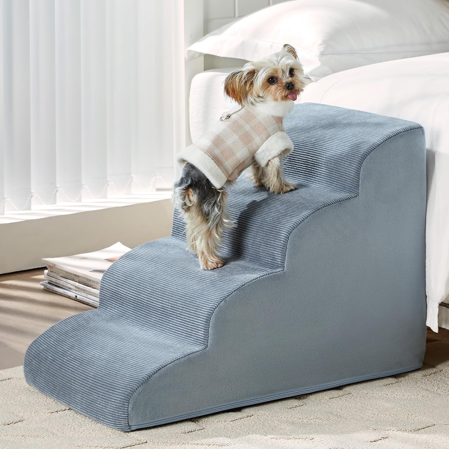 - 【Double Anti-Slip】The soft corduroy surface of Bed stairs for dog ensures a secure grip for your pet's paws. Additionally, The bottom's anti-slip dot firmly secures the dog bed ramp to the ground, Ensuring stability during climbing.