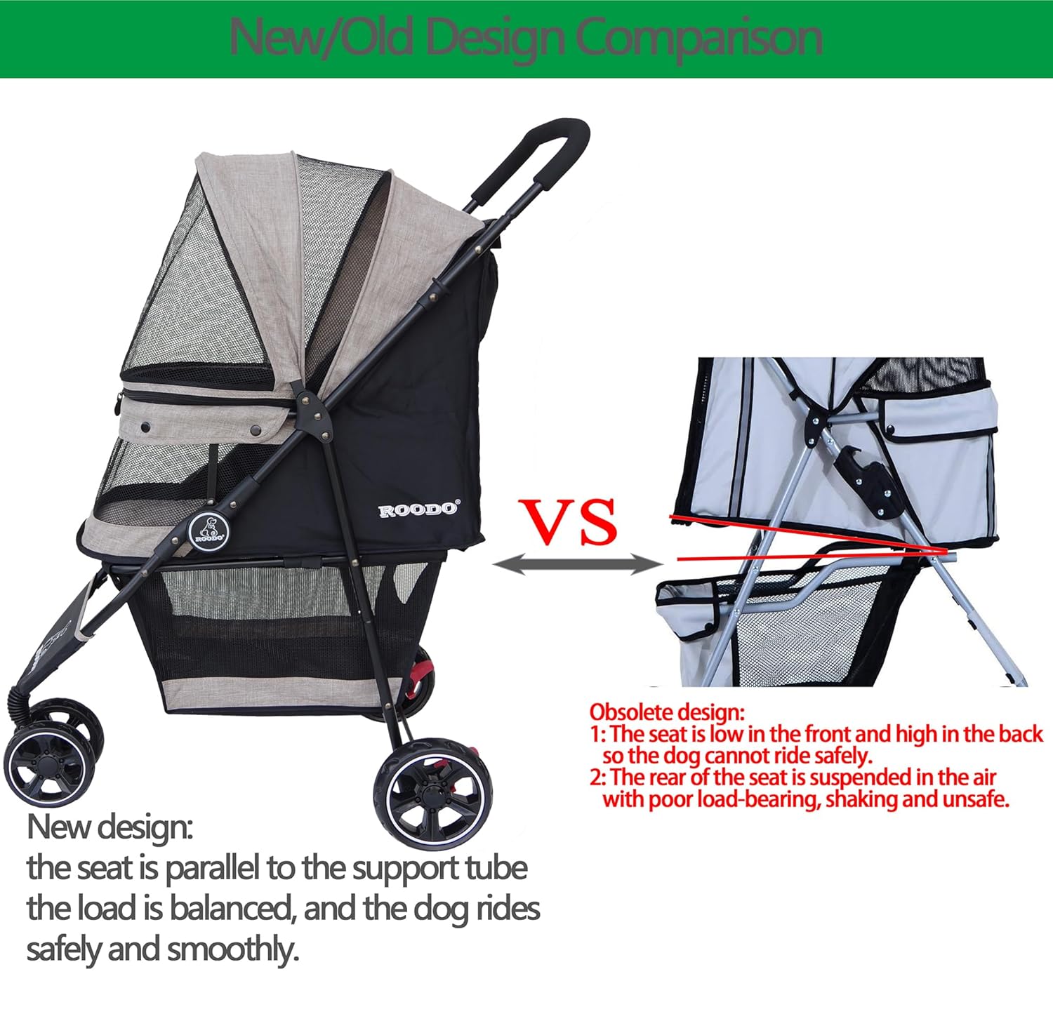 ROODO 3 Wheel Dog Pet Cat Stroller Best Lightweight Foldable Compact Portable Jogger All Terrain Travel Pet Gear Puppy Kitty Stroller for up to 30lbs Medium Small Dogs and Cats(Light Khaki)