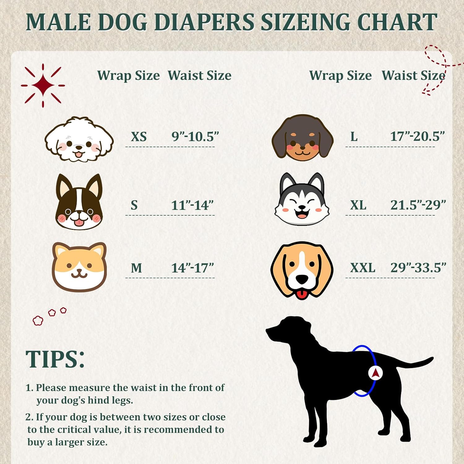 - Washing and care precautions: The doggie diapers for male dogs small is designed with precision stitching for durability and can withstand daily use and frequent washing. When washing, please carefully turn the product over to expose the lining and fasten the hook and loop fasteners. Male dog nappies can be machine washed at 30ยฐC (below 86ยฐF) or below, tumble dried, or air dried at low temperatures. No bleach, no softeners.
