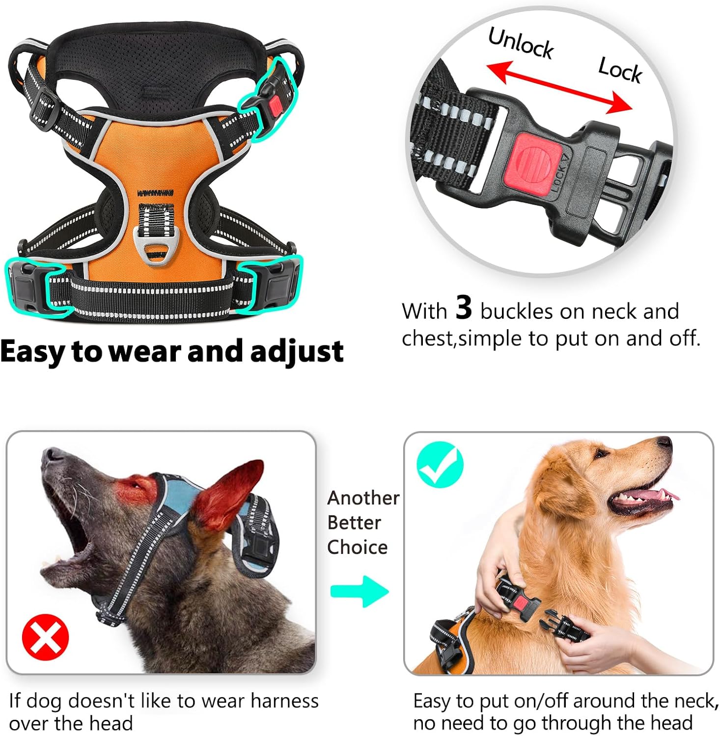 - 【4 WAYS ADJUSTABLE STRAPS】The fit of this pet harness can be completely customized for your pet using the slide adjusters at the chest and neck.You can use its 2 neck straps and 2 chest straps to create a Perfect Fit for your dog with some room of growth. No worries about slipping out or choking.