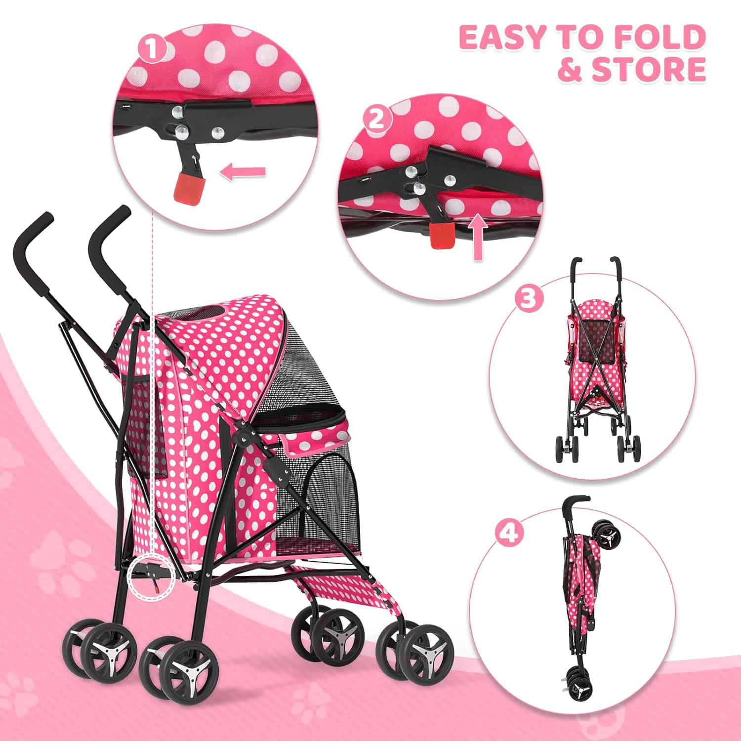 Magshion Compact Pet Stroller for Small-Medium Dogs/Cats up to 22lbs, 4-Wheel Lightweight Umbrella Shaped Portable Puppy Travel Jogger with Breathable Mesh & Rear Storage, Pink Polka Dots