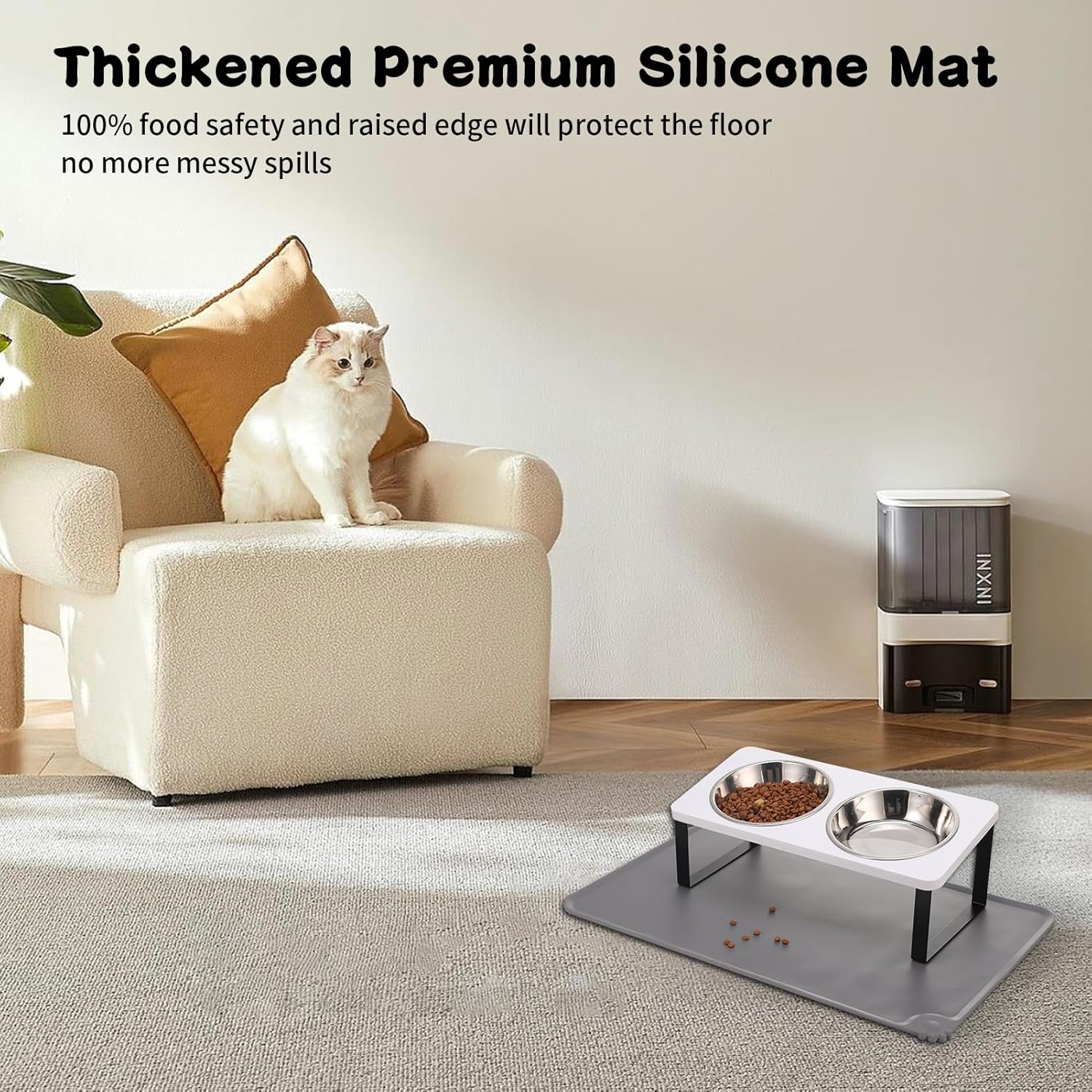Upgraded Elevated Cat Bowls with Food Mat,15°Tilted Stand Anti Vomiting Raised Cat Dishes for Food and Water,2 Stainless Steel Bowls for Cats and Puppy(White)