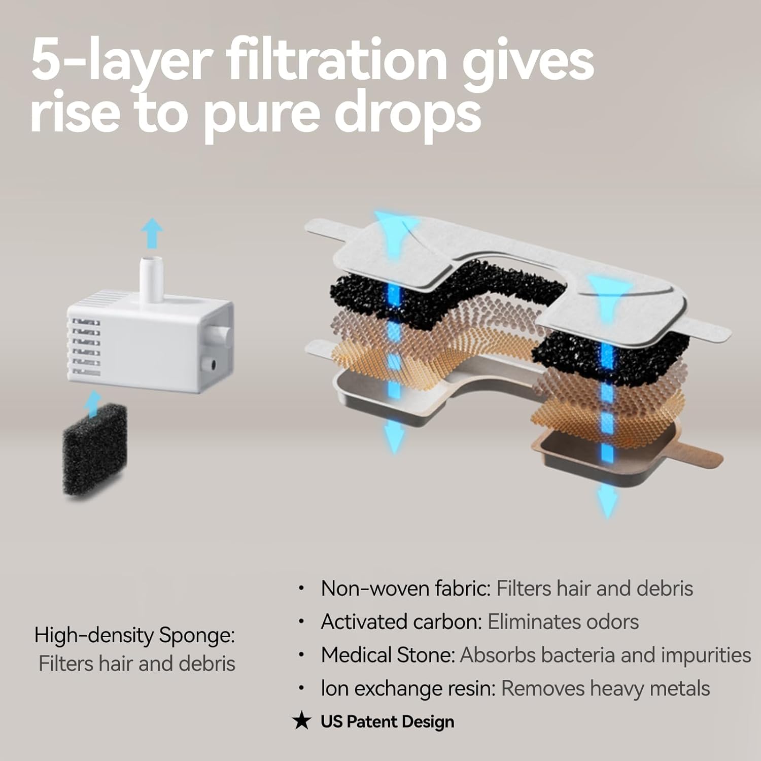 - [5-Layer Filtration System]The cat water dispenser features a 5-layer filtration system. Activated carbon removes bad taste and smell. Ion exchange resin softens tap water. Medical stone extracts heavy metals and releases trace elements. Non-woven fabric filters out hair and dirt. High-density sponge of the pump helps remove tiny particles. (Please search [B0DH1WFD6R] to buy the real filters.)