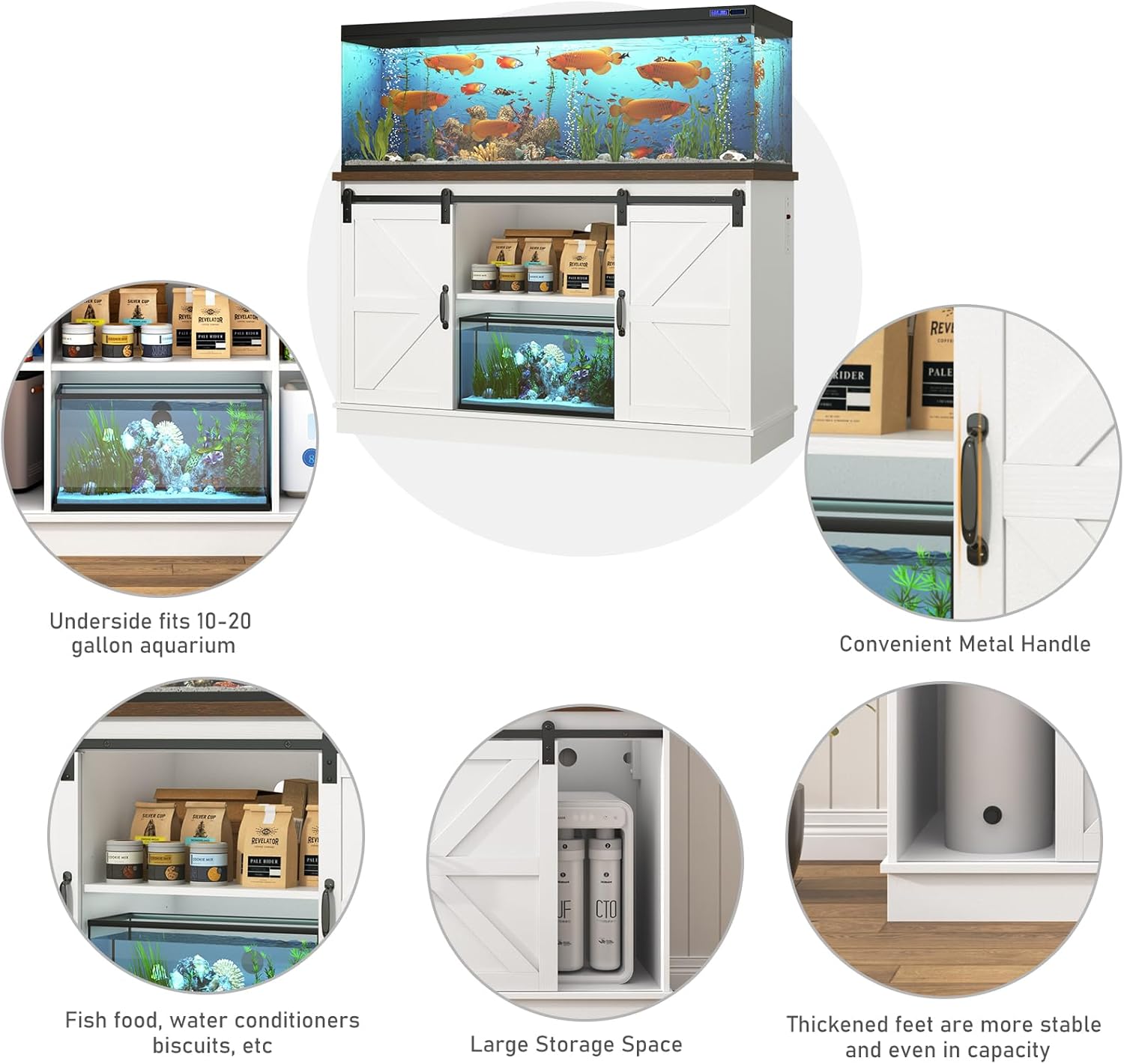 Farmhouse 55-75 Gallon Fish Tank Stand with Power Outlet, Aquarium Stand with Cabinet&Sliding Barn Door, Heavy Duty Reptile Tank Stand for 2 Fish Tank/Turtle Tank/Reptile Terrarium, White