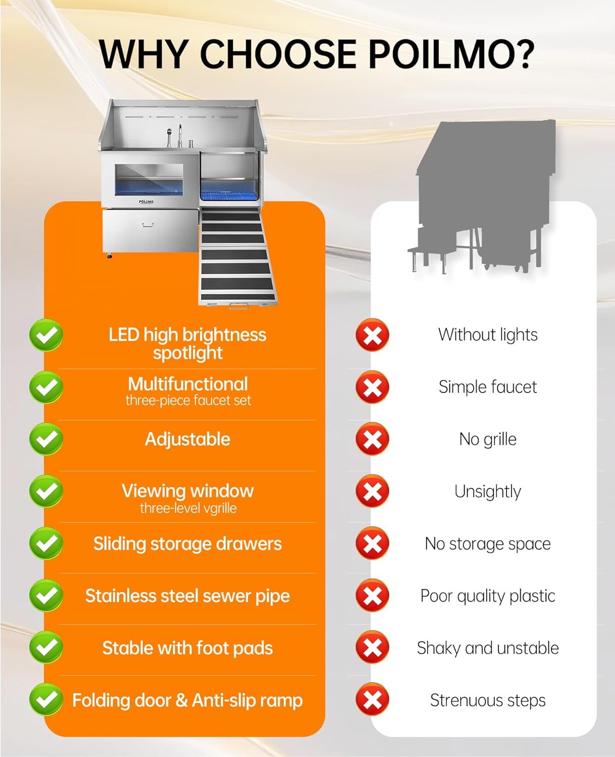 - Innovative and Practical Design: The POLIMO dog grooming station features multiple outstanding design elements: ①IP65 Waterproof high-brightness LED spotlight. ② Grade A tempered glass observation window. ③ The bathtub’s side panels feature a curved slide design, making it easier to operate④ Two-piece floor grid, adjustable to three different heights. ⑤ Sliding storage drawer for organized storage. ⑥ Multi-function faucet and showerhead, adjustable to left, center, or right positions.⑦ Two drainage options are available: one with a pet hair catcher and another stainless steel drain pipe featuring an odor-blocking S-trap design