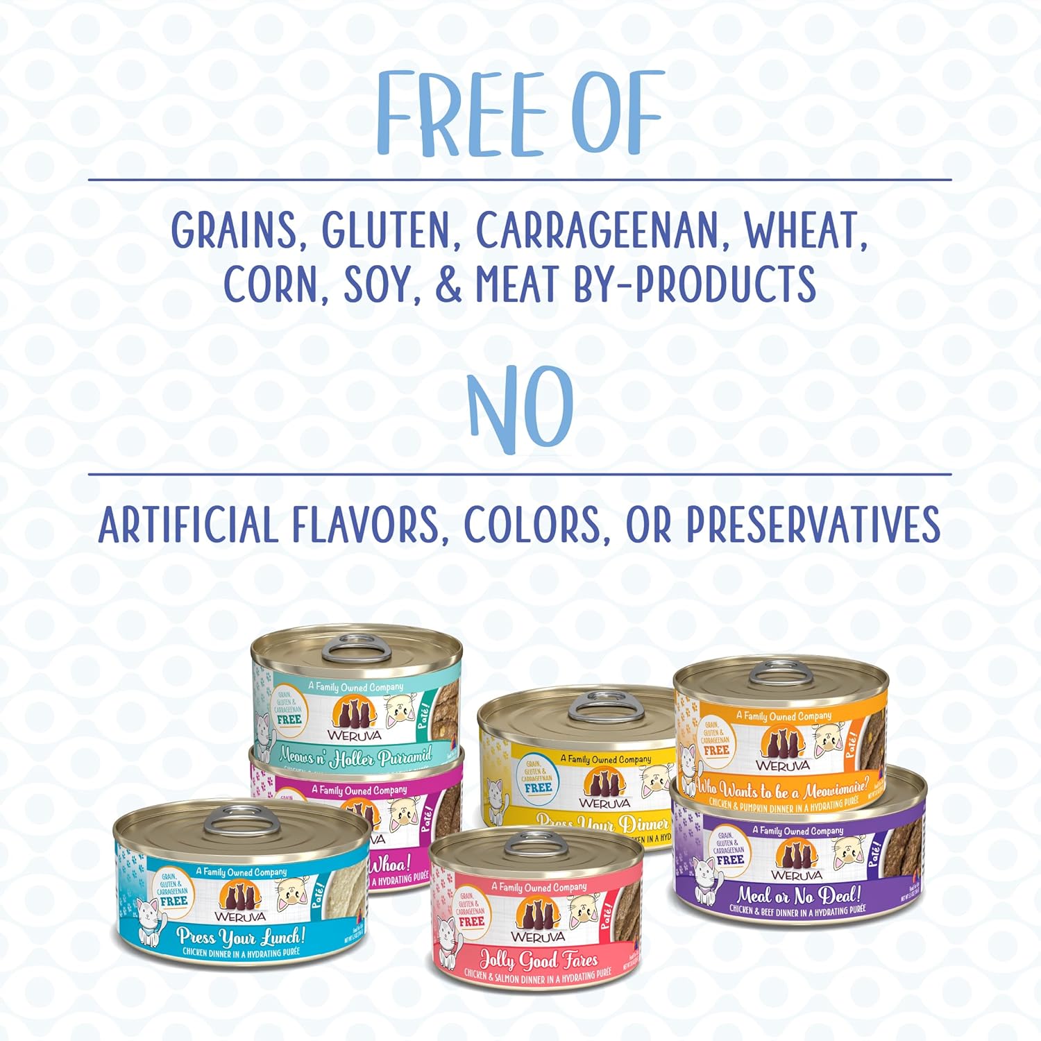 - Weruva Wet Cat Food, The Chicken Lounge Paté Variety Pack 3oz, Pack of 12 includes four (4) of each: Press Your Lunch, Press Your Dinner, Who Wants to be a Meowionaire.